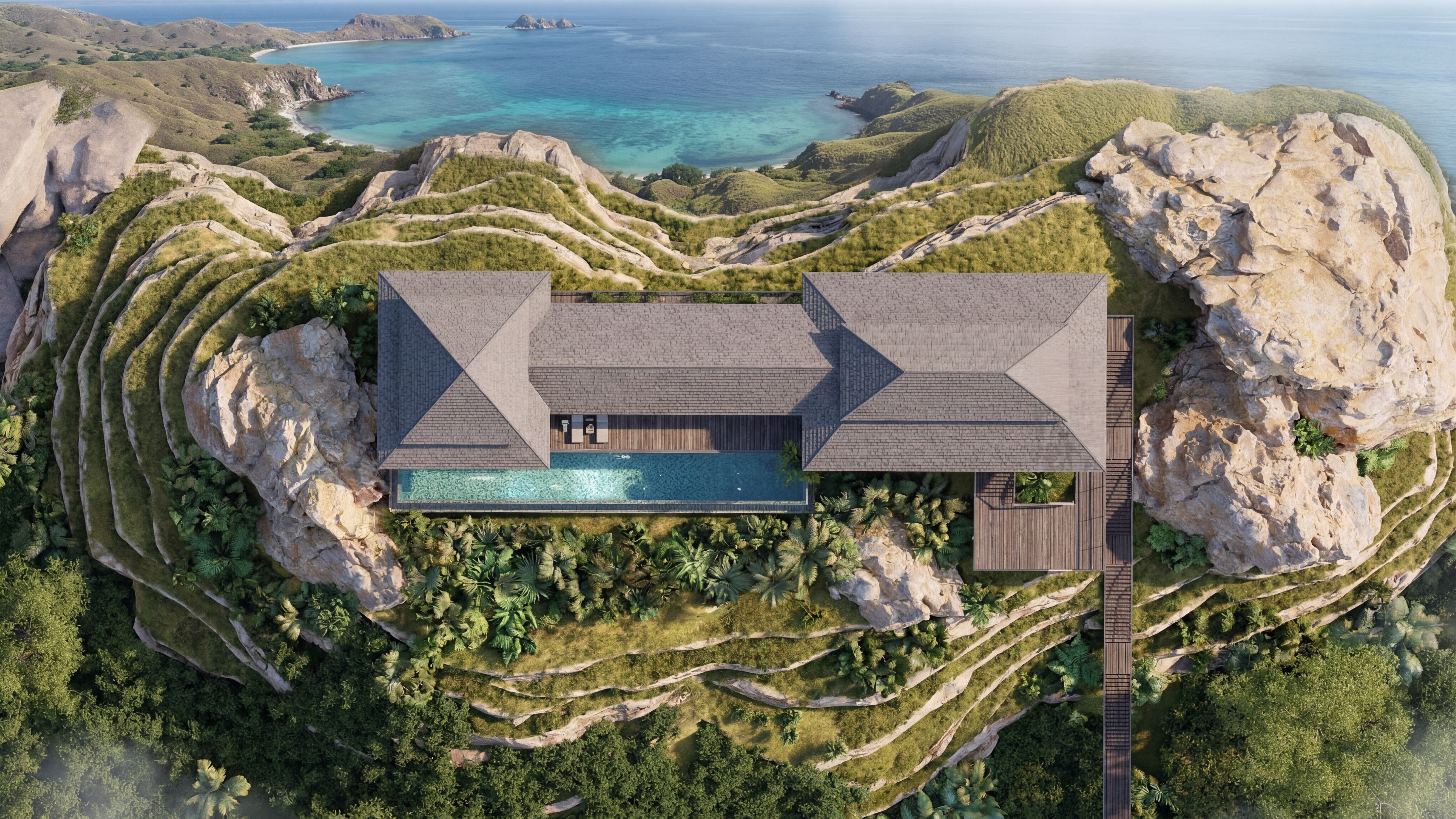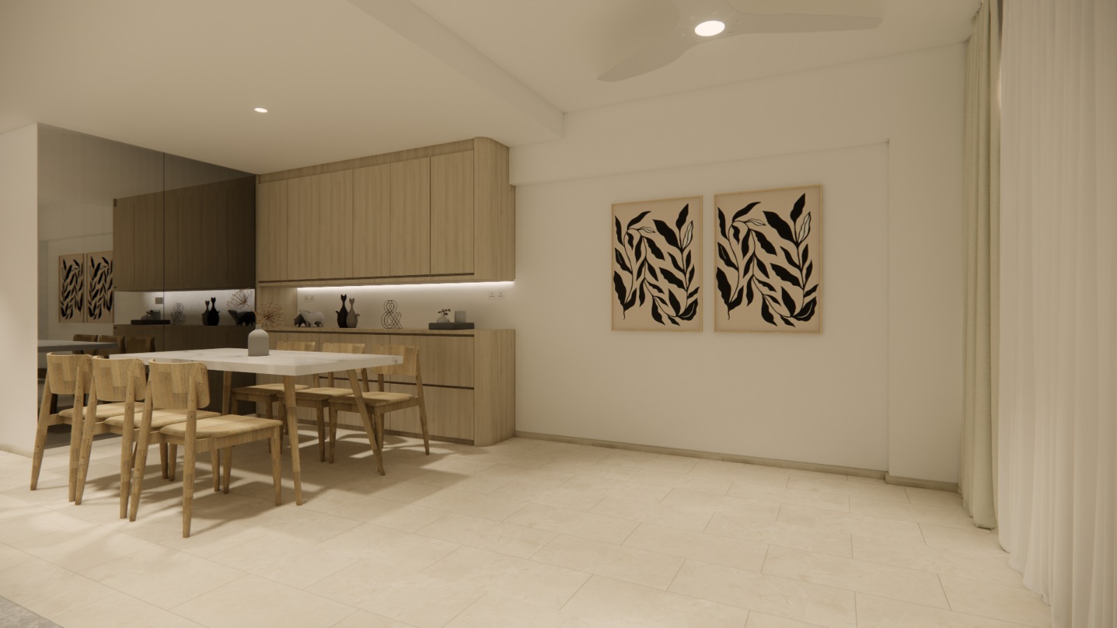 insert the sofa and coffee table and rug from the reference image into the living room scene match the exact design proportions upholstery texture and color of the reference sofa place the sofa against the back wall under the artwork aligned flush to the wall ensure correct perspective scale and lighting so the sofa integrates naturally into the space match shadows floor contact and ambient warm lighting keep all other furniture and layout unchanged maintain photorealistic interior rendering quality preserve the original interior scene exactly as provided do not modify regenerate or restyle the background including walls flooring cabinetry dining table chairs lighting artwork or camera angle use the original image as a fixed base do not re render or reinterpret the scene perform only a localized edit to insert the sofa all background elements must remain pixel consistent and unchanged
