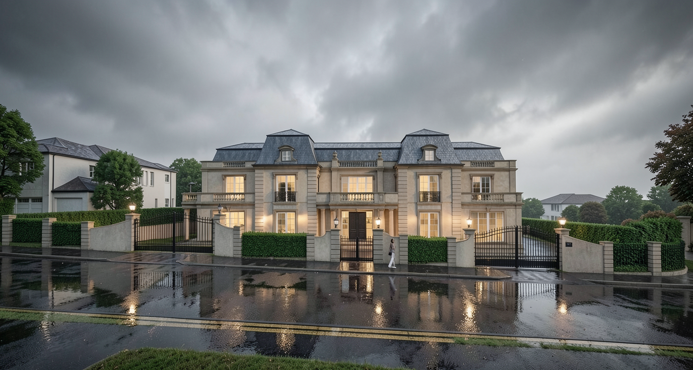 render using exact massing contemporary farmhouse with white siding stone foundation metal roof wooded setting at dusk