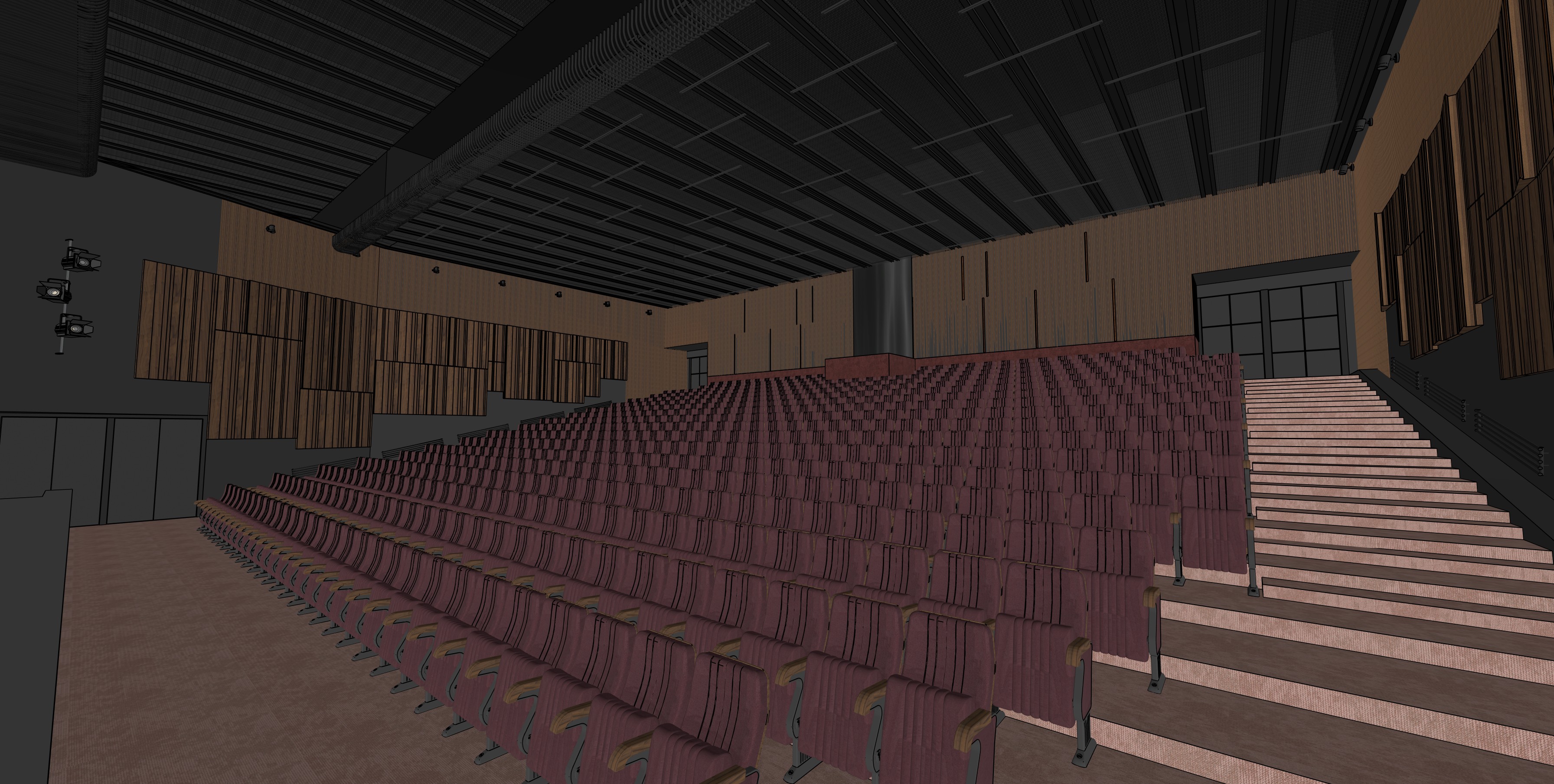 transform the provided theatre interior image into a high end photorealistic render while keeping everything exactly the same same proportions same materials and same spatial configuration do not move or alter any objects geometry textures colors or furniture positions the chairs velvet materials colour should read realistically the black wall is from acoustic panels from reciclated materials carpet on the floor carpet on stairs carpet on front of stage keep the color of the carpet black vinyl on stage wooden panels with carved lines a vertical led light is hidden vertically in the slanted panels top strip made of thin wooden slats black curtain led linear luminaire on ceiling back doors black carpet cladding