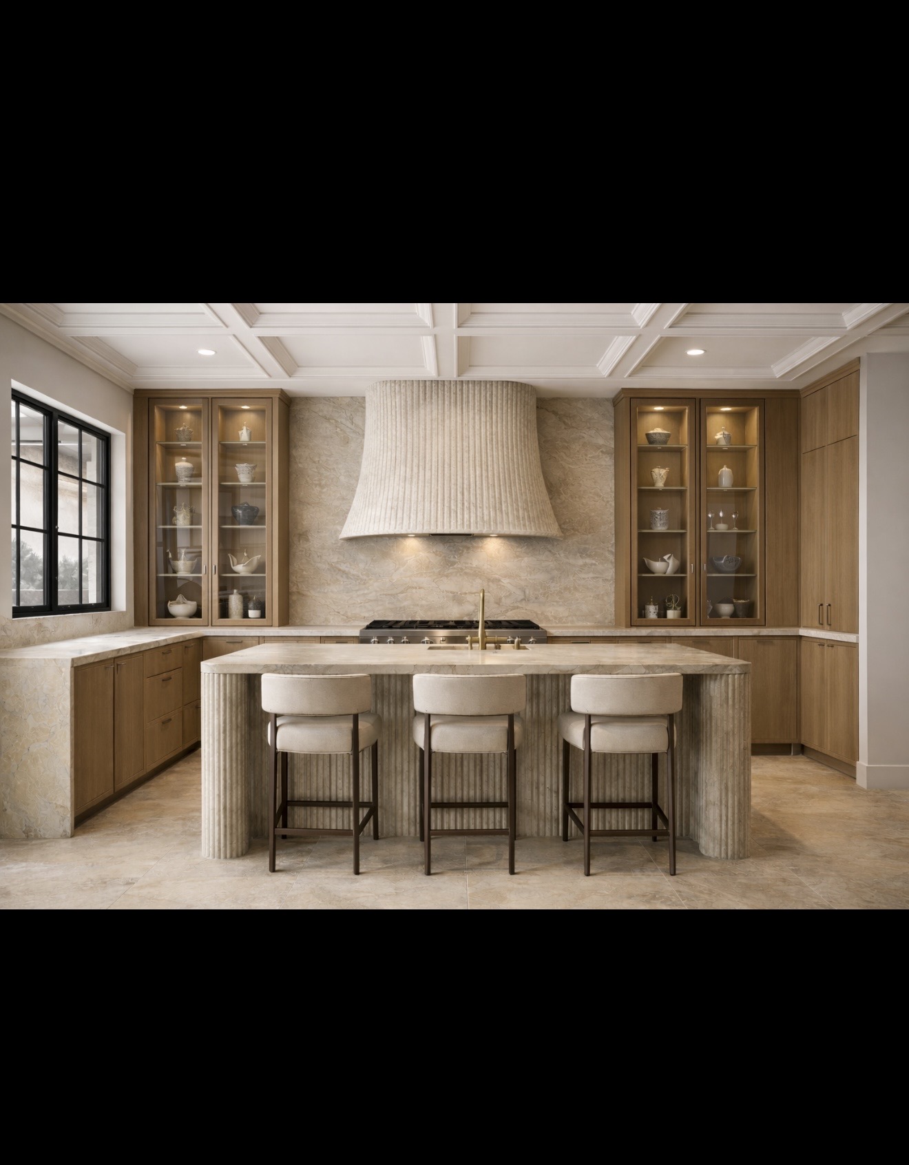 can you make the walls next too the window wider and add in a same height cabinet connecting to the glass door cabinet next to that window also touching countertop to ceiling