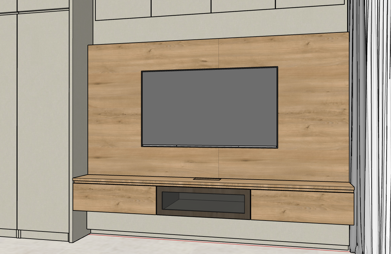 light marble flooring soft daylight from sliding doors on the right no interior light led strip light above tv wood panel led strip light below suspended tv console