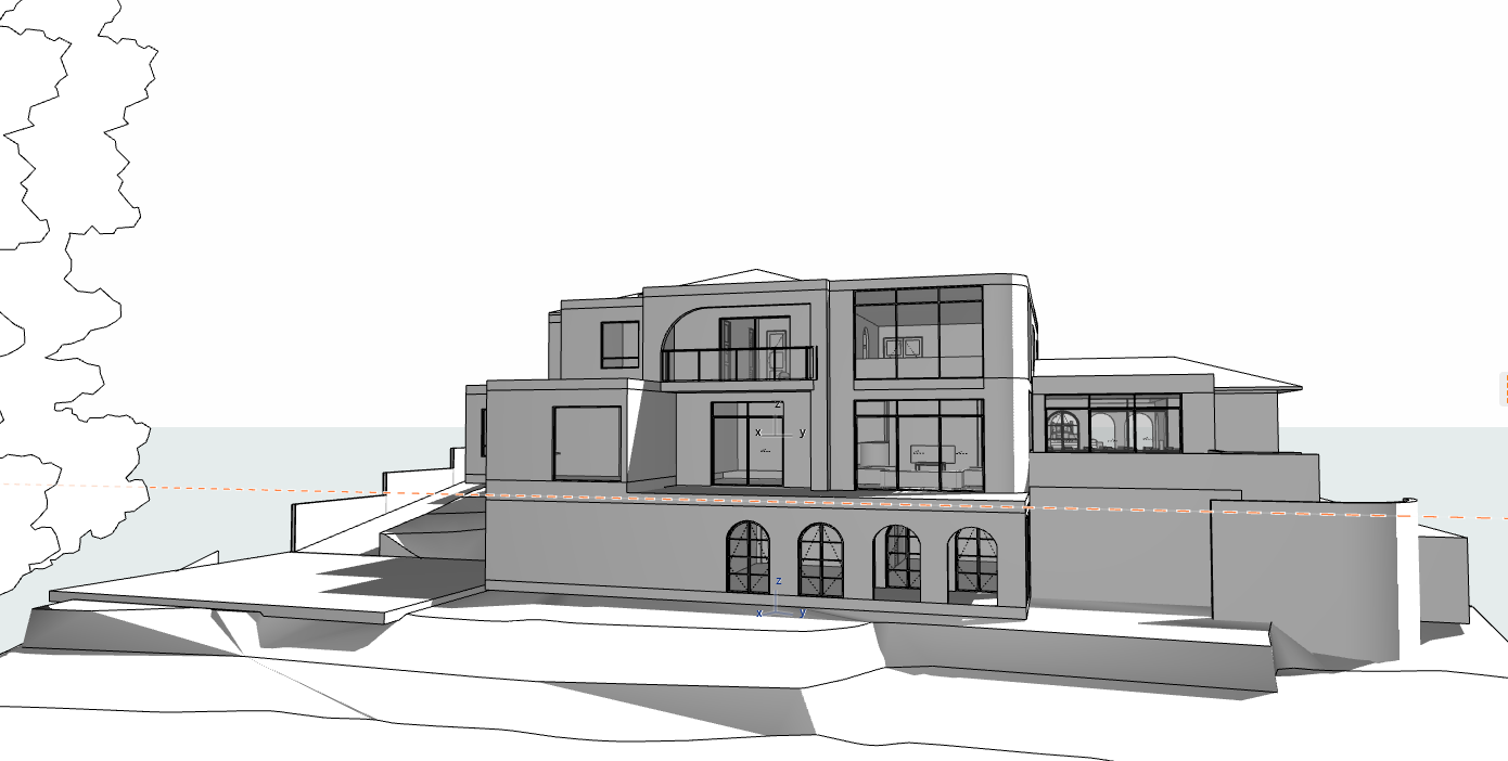 exterior shot keeping the exact design and proportions from the original style the building in a modern mediterranean look with white plaster walls black joinery glass balustrades with a simple single steel handrail and balusters include a grassy slope landscape in the foreground hills in background
