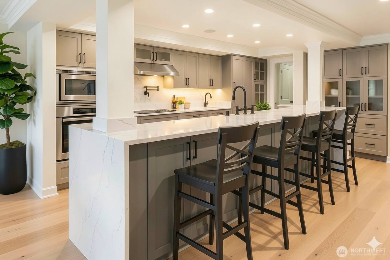 circular exterior staircase with a metal stringer and steps made of irving steel grating the design should look modern with very clean and refined lines include a simple wrought iron railing that feels minimal yet elegant surround the staircase with garden landscaping for ambiance add indirect lighting integrated into the steps to create a subtle glow the metal stringers should be lacquered in a dark gray finish put the door of the elevator to the left side of the stairs