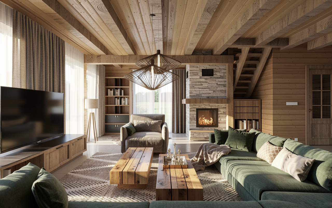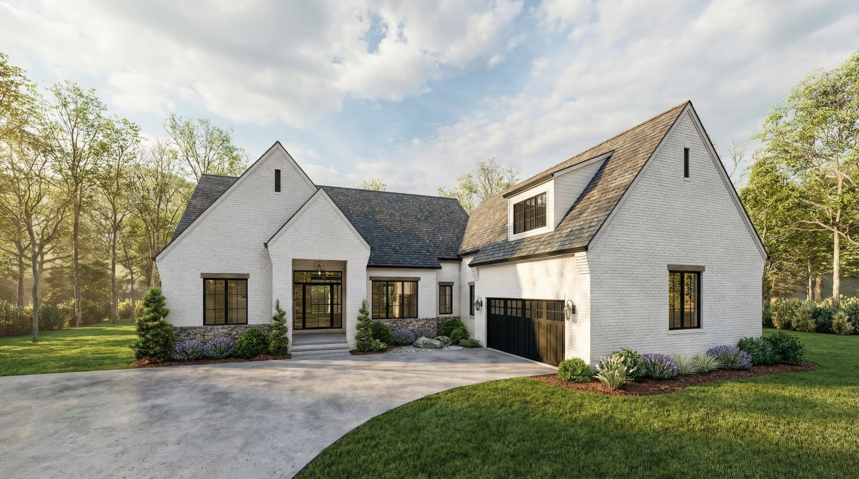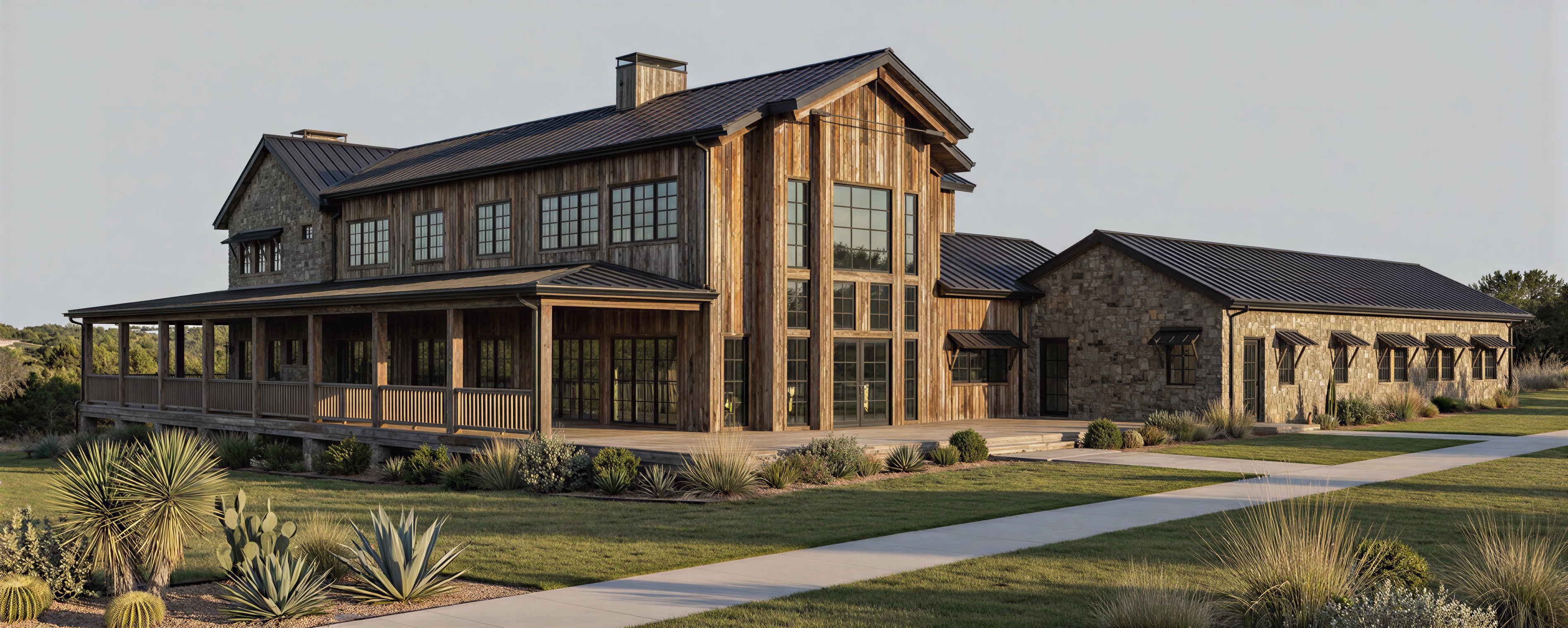 apply the material quality realism lighting and architectural visualization style from the reference image to the provided architectural model preserve the exact massing rooflines window locations proportions and architectural geometry of the model exterior materials remain unchanged reclaimed weathered vertical wood siding in warm brown tones with natural variation authentic moss rock stone veneer at lower walls and base conditions matte black standing seam metal roofing and black aluminum window frames with realistic glass reflections emphasize the building s relationship to a subtle engineered grade change that gently slopes down toward a pond below the terrain should read as controlled site grading rather than a dramatic cliff maintain a clean defined edge at the lawn where the grade begins to fall but avoid steep rock faces or vertical drops the pond should sit slightly below the finished floor elevation with calm water and soft natural reflections the transition between lawn and slope should feel intentional and minimal with restrained planting and no exaggerated erosion or rugged terrain add realistic depth through accurate material thickness window reveals shadowing and construction detail without altering the design lighting natural daylight soft late afternoon sun neutral sky realistic shadows ultra photoreal architectural rendering with high material fidelity no stylization or exaggeration camera positioned at eye level with a slight downward angle along the length of the building to express the pond side condition avoiding dramatic or cinematic cliff perspectives