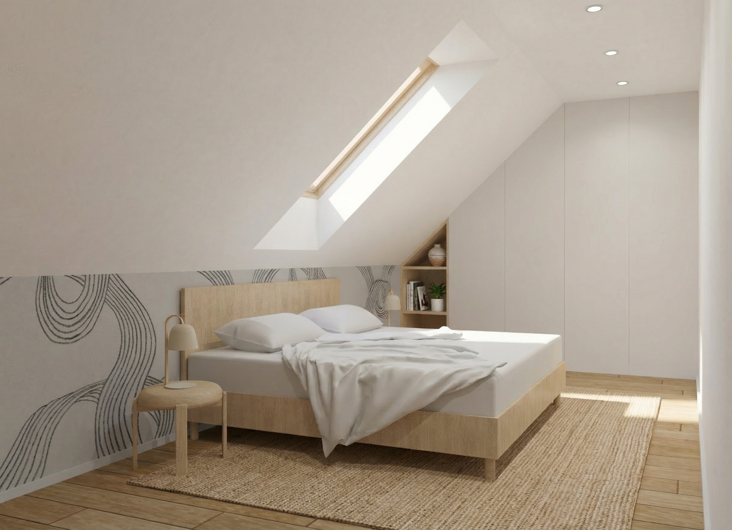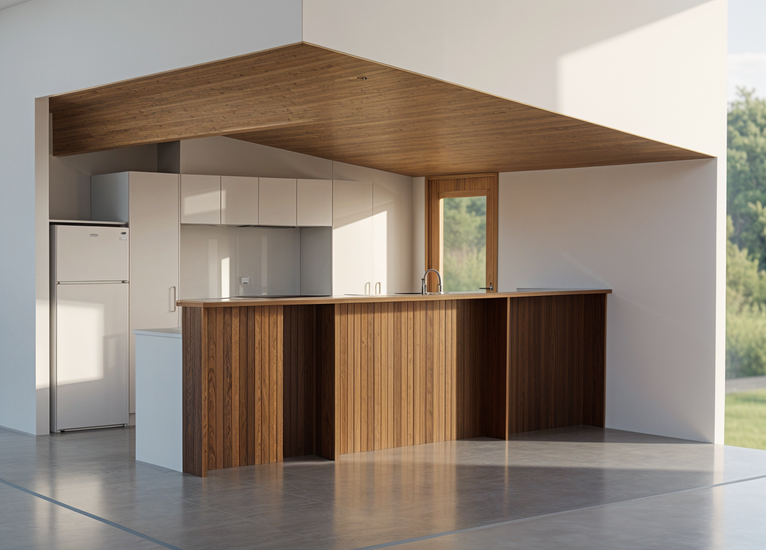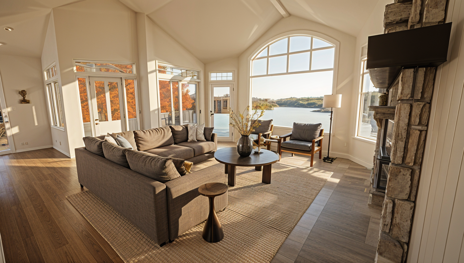 apply the material quality realism lighting and architectural visualization style from the reference image to the provided architectural model preserve the exact massing rooflines window locations proportions and architectural geometry of the model exterior materials remain unchanged reclaimed weathered vertical wood siding in warm brown tones with natural variation authentic moss rock stone veneer at lower walls and base conditions matte black standing seam metal roofing and black aluminum window frames with realistic glass reflections emphasize the building s relationship to a subtle engineered grade change that gently slopes down toward a pond below the terrain should read as controlled site grading rather than a dramatic cliff maintain a clean defined edge at the lawn where the grade begins to fall but avoid steep rock faces or vertical drops the pond should sit slightly below the finished floor elevation with calm water and soft natural reflections the transition between lawn and slope should feel intentional and minimal with restrained planting and no exaggerated erosion or rugged terrain add realistic depth through accurate material thickness window reveals shadowing and construction detail without altering the design lighting natural daylight soft late afternoon sun neutral sky realistic shadows ultra photoreal architectural rendering with high material fidelity no stylization or exaggeration camera positioned at eye level with a slight downward angle along the length of the building to express the pond side condition avoiding dramatic or cinematic cliff perspectives