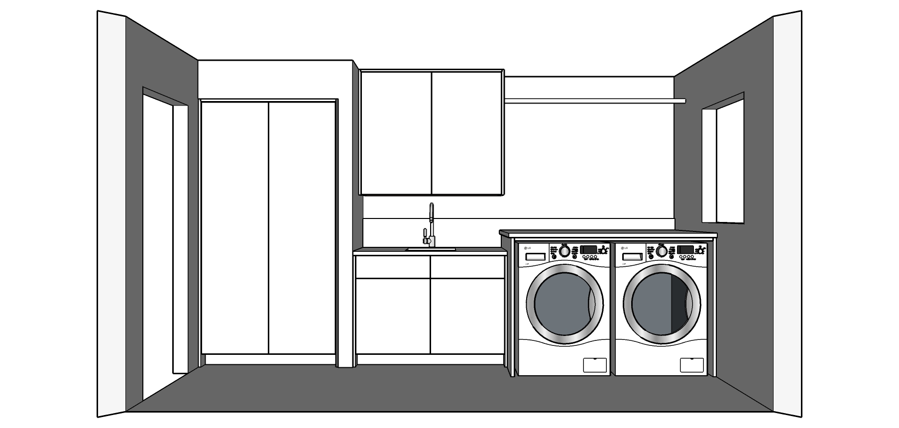 white cabinets flat slab doors and drawer fronts no hardware door on right is interior door lg washer dryer are white no shelf above hanger rod hanger rod is chrome door on right is interior door no door on right walls are white rift sawn white oak hardwood floors no door on the right on this is a wall door is on the left the drawer under the sink should be two drawer fronts lining up with the doors below