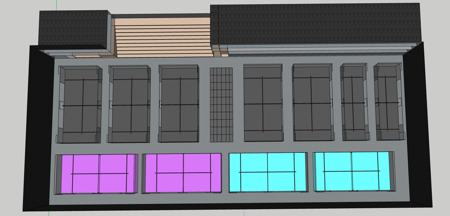photorealistic architectural visualization bird s eye aerial perspective view from above front left angle large premium indoor padel social club complex 8k quality cgi render court layout total 11 courts row 1 front 5 standard padel courts in a row 2 single padel courts at the far end narrower shorter courts all enclosed in tempered clear glass panels with black powder coated steel frames row 2 behind 4 standard padel courts in a row same glass and steel enclosure court turf colors row 1 courts alternating purple violet and black graphite synthetic turf 2 single courts teal turquoise turf row 2 courts mix of purple and black graphite turf black steel central spine corridor between the two rows white court lines clearly visible on all surfaces building left side 3 story ground floor cafe restaurant with full floor to ceiling glass facade warm interior lighting visible people inside 2nd and 3rd floor coworking business center concrete and glass facade large panoramic windows cantilevered overhang on top floor tribune reception wooden grandstand tribune light oak 5 6 stepped rows facing courts left side of hall reception lobby area with warm light oak wood cladding open pergola canopy structure people visible at desk materials polished dark charcoal concrete flooring throughout light oak wood tribune reception ceiling panels pergola black powder coated steel structural frames tempered clear glass court enclosures and building facade dark matte perimeter walls and roof structure lighting dusk evening scene bright cool white led floodlights illuminating each court from above warm golden light from cafe ground floor and reception area dramatic contrast between brightly lit purple teal and graphite courts and dark structural elements subtle god rays through glass roof panels atmosphere vibrant premium urban sports and lifestyle destination players visible on multiple courts mid game small groups of people at reception and tribune modern architectural aesthetic industrial meets warm scandinavian style photorealistic architectural cgi bird s eye isometric perspective clean neutral grey background slight depth of field on perimeter edges reference style big architects sn hetta sports facility renders no sketchy lines no sketchup style full photorealistic texture and materials