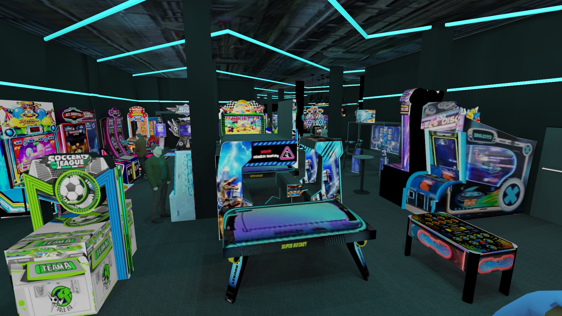 an arcade and gaming hall the machines glow brightly black walls and a black ceiling the floor covered in dark gray carpet turquoise light lines on the ceiling and turquoise lighting under the furniture create a photorealistic effect