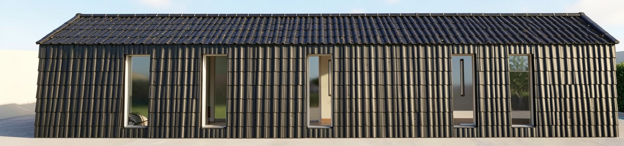 cedar cladding to the front led light under the overhang black box profile to the side glass windows and a slideing door to the front all to be black pvc