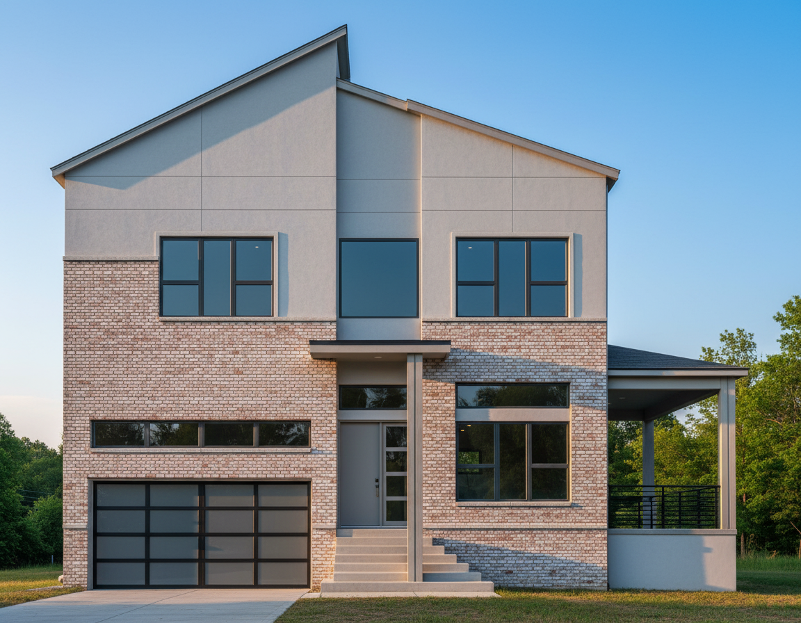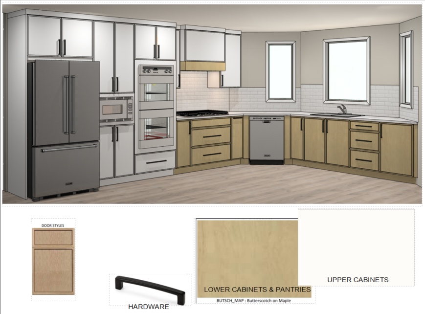 a modern kitchen interior with a sophisticated and welcoming atmosphere the upper cabinets and tall units are slim shaker sleek matte white and black handles exuding elegance the lower cabinets feature the same slim shaker style in a light oak finish with a polished white marble countertop the flooring is a light ash wood adding warmth to the space three large windows allow natural light to pour in on a sunny summer day enhancing the bright and airy environment the backsplash consists of glossy white subway tiles reflecting the modern appliances which have a stainless steel finish soft ambient lighting creates a cozy yet contemporary atmosphere