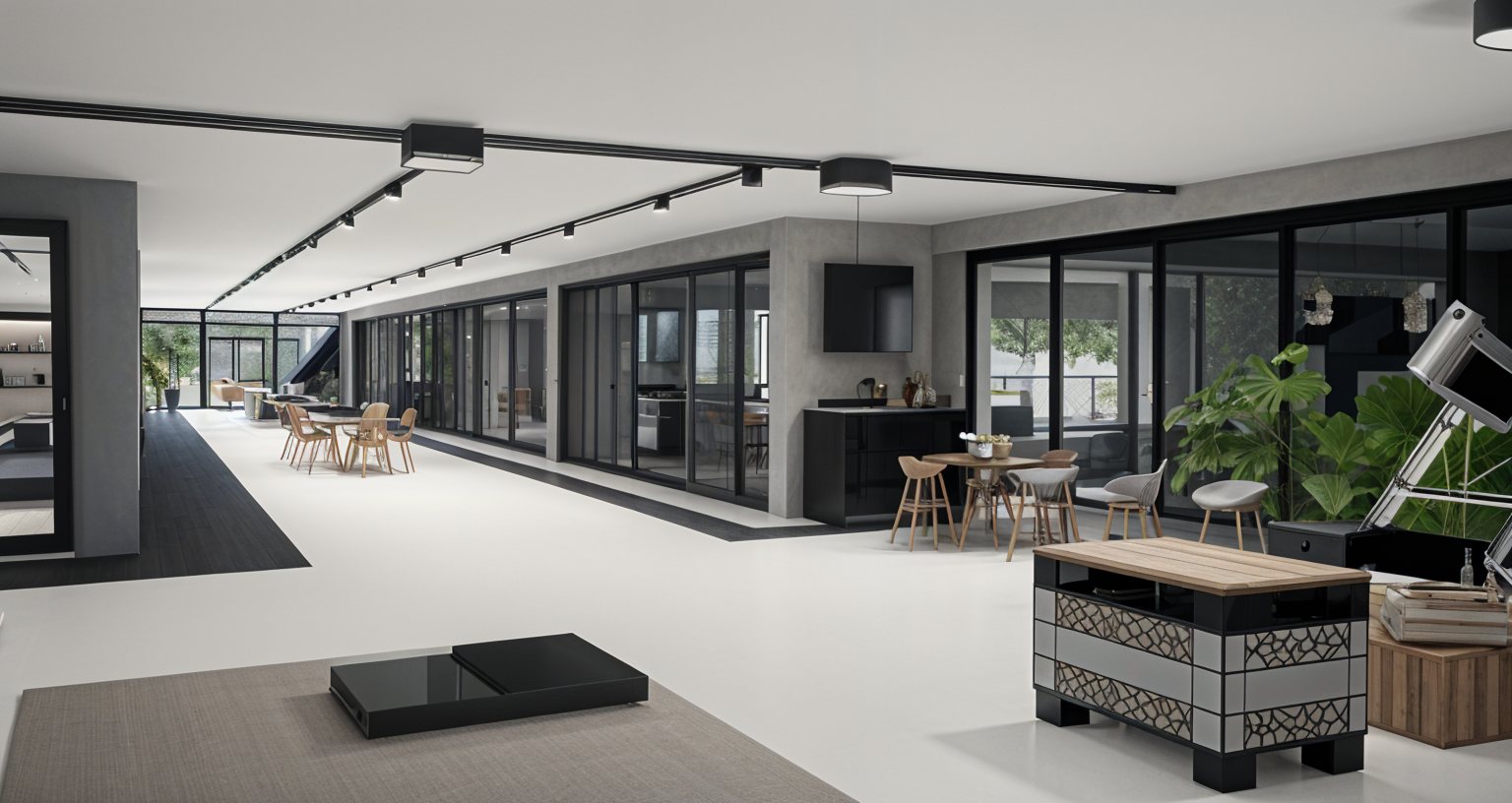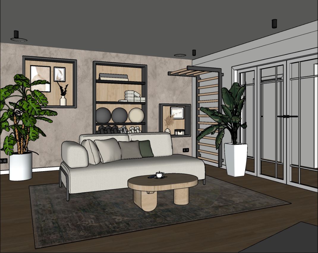 interior shot make a comfortable home gym with sofa in the centre and few deep green plants
