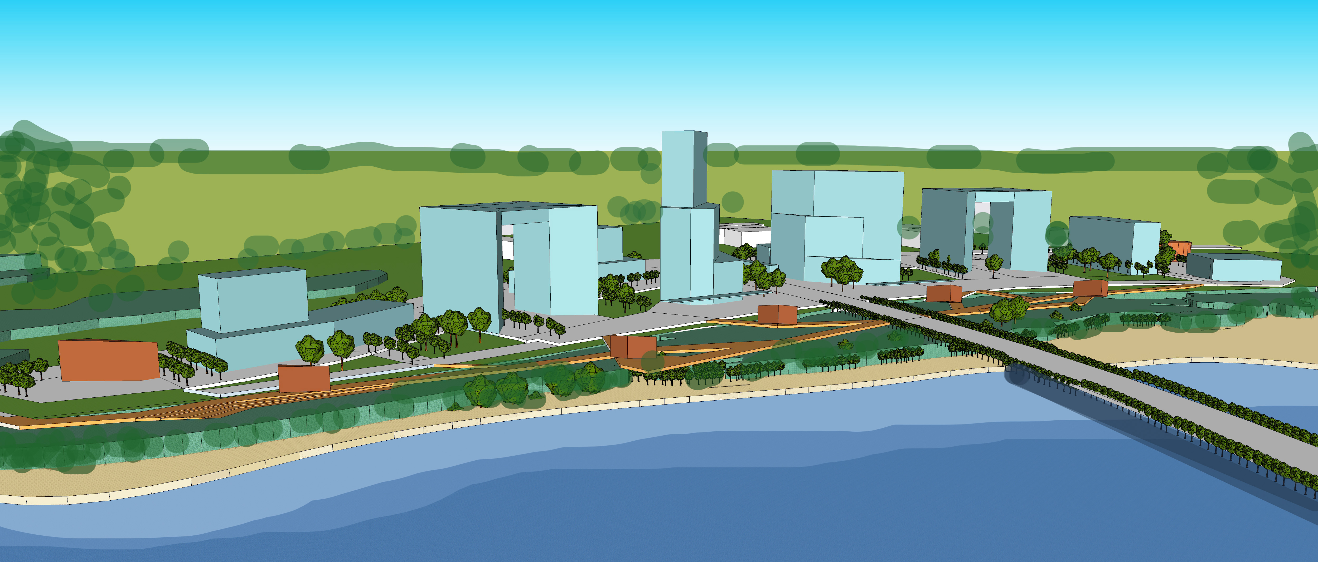 es un desarrollo urbano con edificios vidriados en un lugar tropical con mar turquesa entre los edificios y la playa hay un desnivel de 6 metros en el nivel inferior hay manglares al nivel de los edificios y por entre los manglares hay una pasarelas de madera haya edificios mas bajos con forma triangular que son edificios culturales se tiene que ver moderno y alegre como el sea front de ciudades como dubai aunque mas bajos necesito que respetes lo mas posible la morfologia de los edificios que te estoy pasando