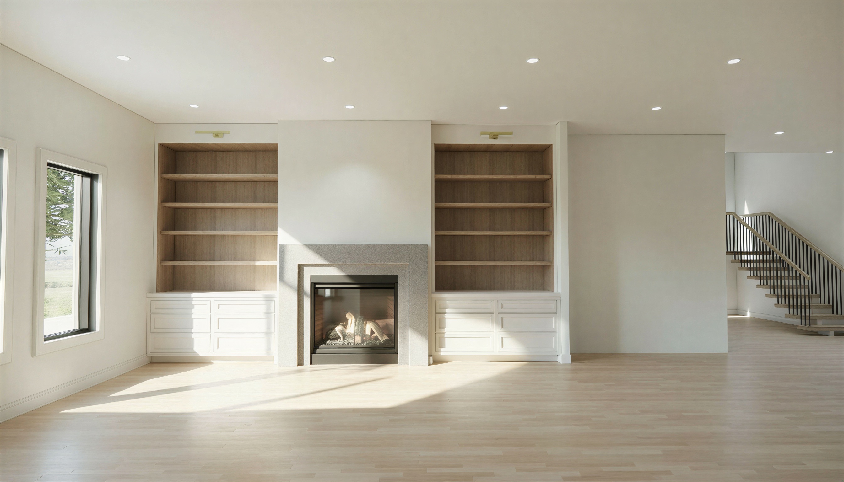 materials in the space include builddirect engineered wide plank flooring in seashore finish walls and ceiling painted origami white by sherwin williams the wood flooring should show authentic grain correct plank scale subtle tonal variation and a natural matte sheen walls and ceilings in origami white should appear clean soft and naturally illuminated with balanced daylight and realistic depth natural light should be softly entering through the windows in an editorial photography style creating gentle highlights natural interior bounce light and subtle shadow depth similar to high end architectural photography the furniture currently shown in the rendering should be treated as placeholders and replaced with high end restoration hardware style furnishings that feel timeless upscale and well curated furniture should remain similar in scale and placement shoudl lremain centerend on the fireplace add tasteful high end staging accessories such as textured neutral pillows sculptural ceramic or stone vessels refined trays and coffee table books subtle decorative objects appropriate for a luxury staged home add one large scale modern minimalist artistic wall piece centered above the fireplace the artwork should feel like a curated gallery quality contemporary piece with abstract composition subtle texture and neutral tones