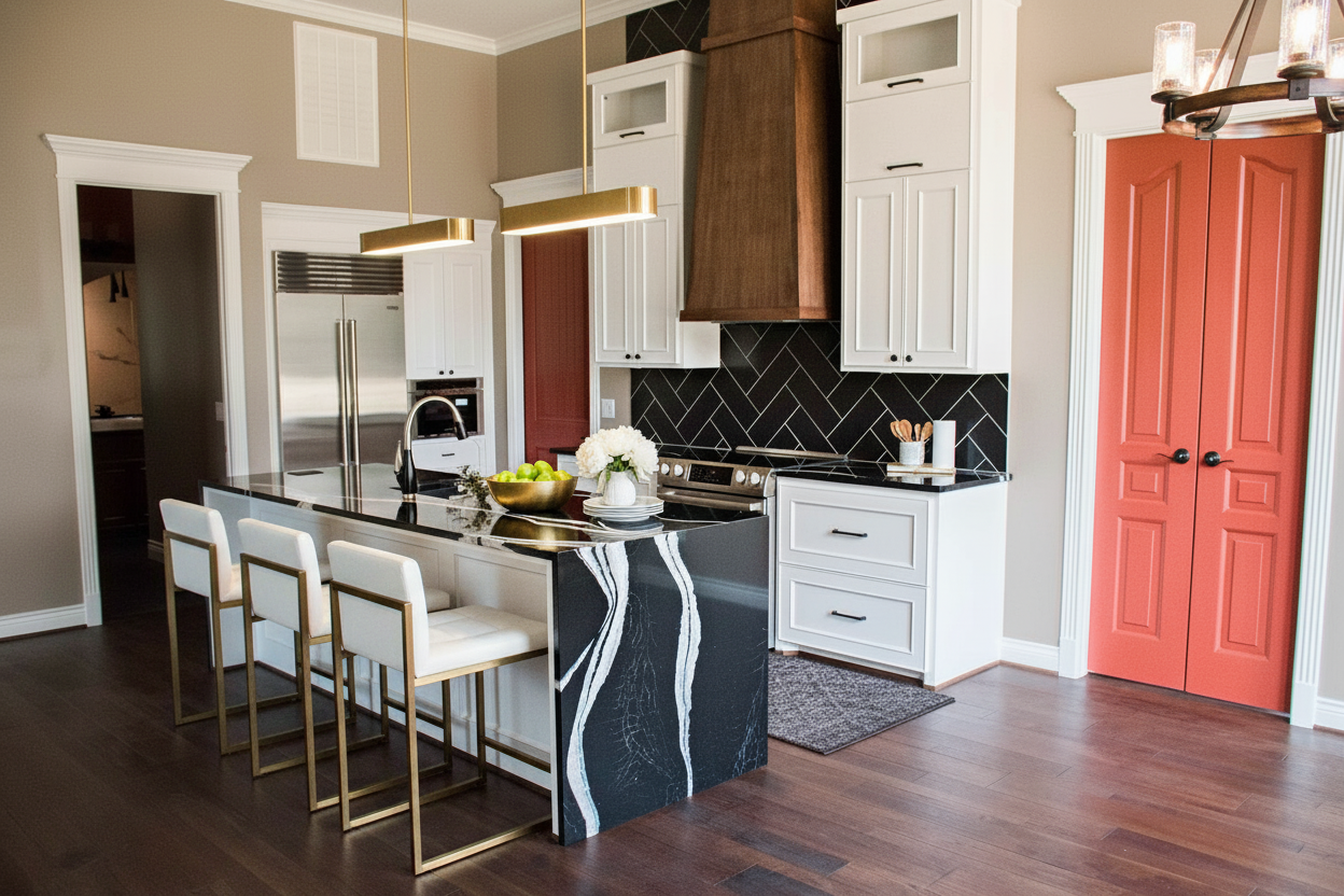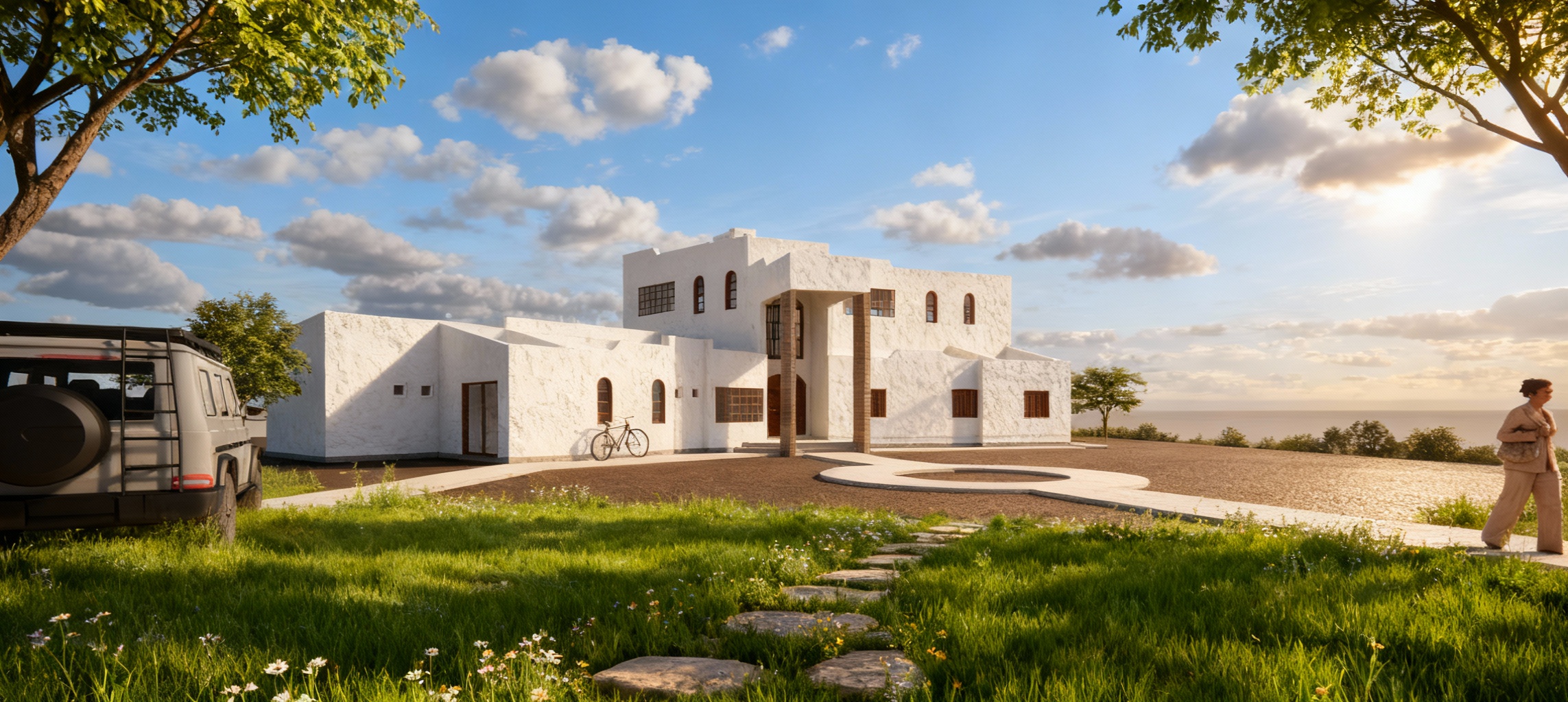 make the stone wall cladding smooth add mediterranean style landscaping add lighting to the interior of the house but keep the same daylight level keep the roof flat make the timber ceilings in a grey timber