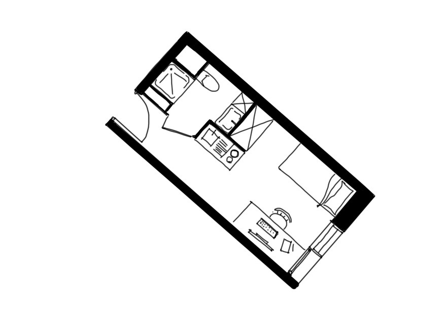 convert this floor plan into a realistic isometric 3d view of a living room show the space from an elevated angle with furniture walls and details visible warm decoration and wooden furniture student use the same furniture as shows on the plan do not change the orientation of the floorplan