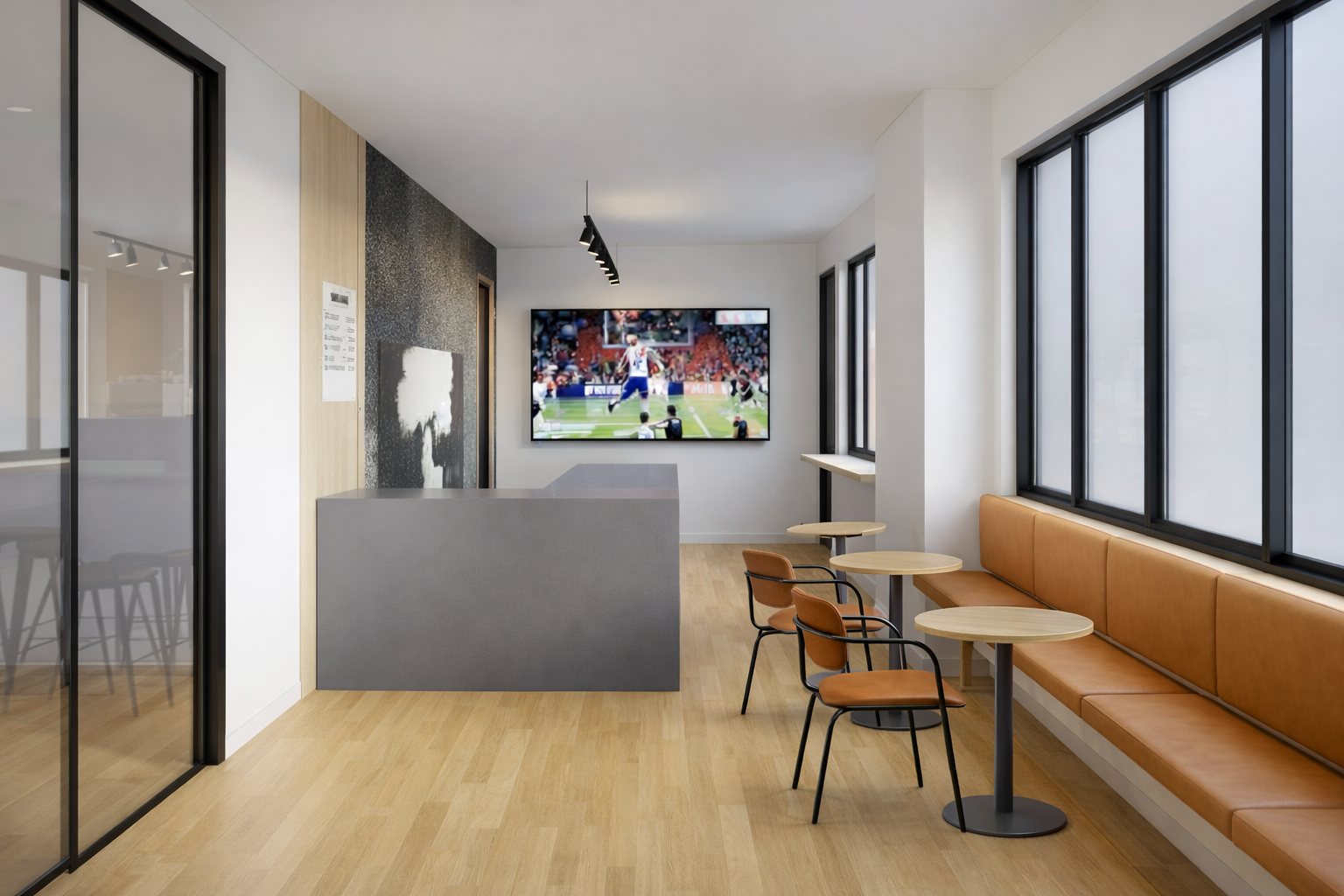 leave two round tables two chairs and delete the third table closest to the wall