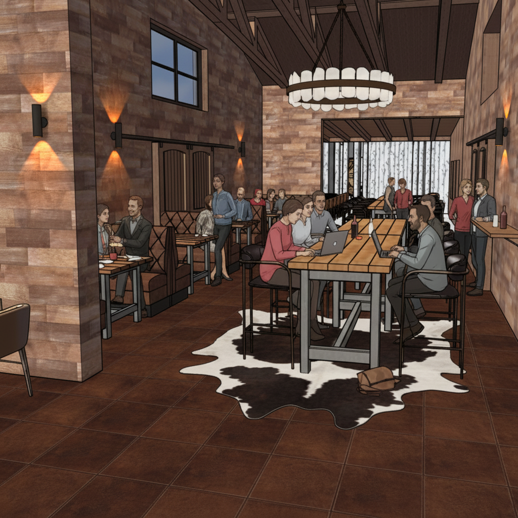 recreate this image as a photo realistic render the image depicts a whiskey lodge with ecodomo leather floor tiles barn wood walls and leather furniture switch the hanging chandelier for a ghiaccio round chandelier from fancilamps the atmosphere should be cozy and inviting with warm lighting architecture