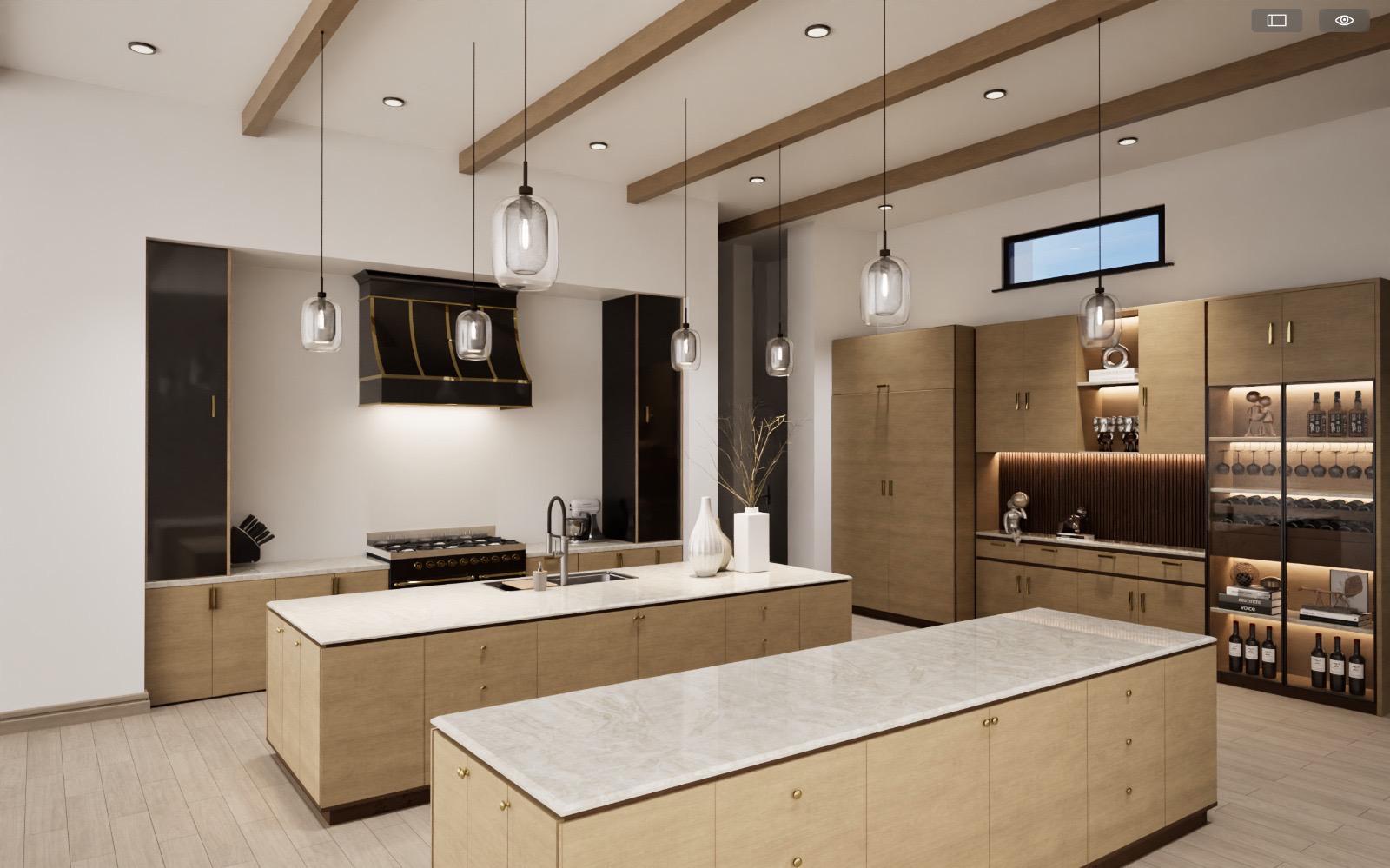 change the hood to be full width with no upper cabinets make the hood a charcoal cement look black cabinets