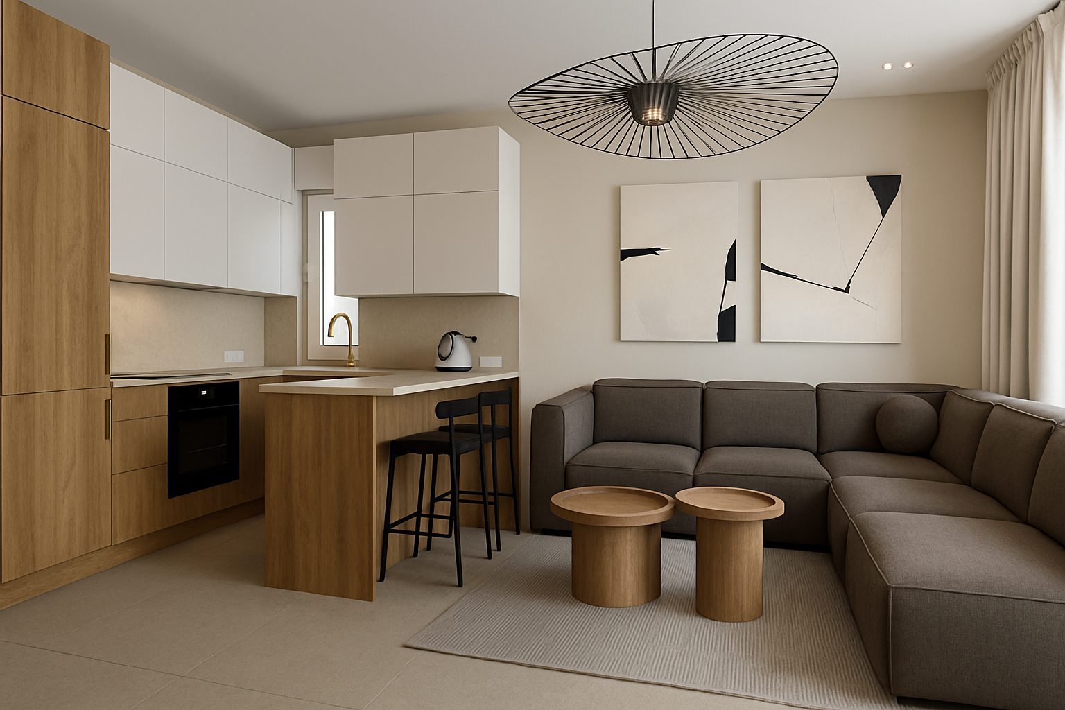 natural and soft delicate warm tones day light japandi style warm wood glossy worktop