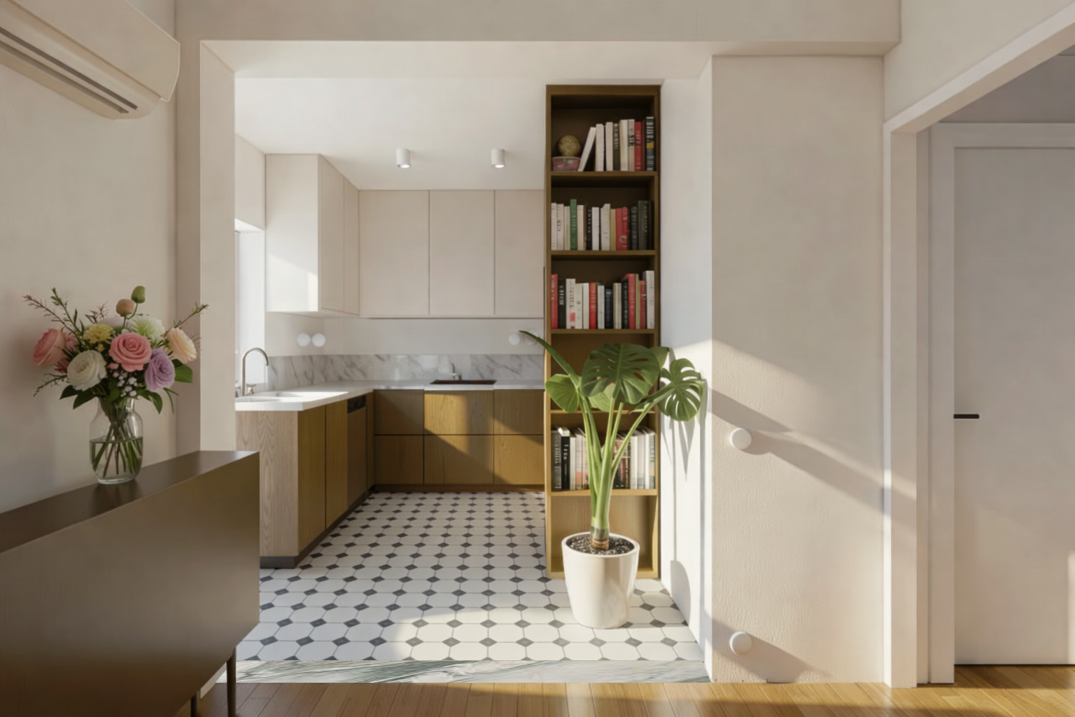 remove the vase with flowers on the left of the image make the wooden console a bit more realistic do not touch absolutely nothing else from the picture
