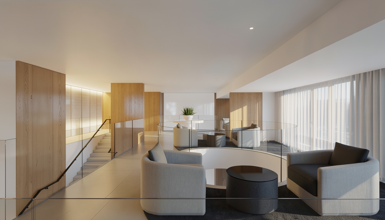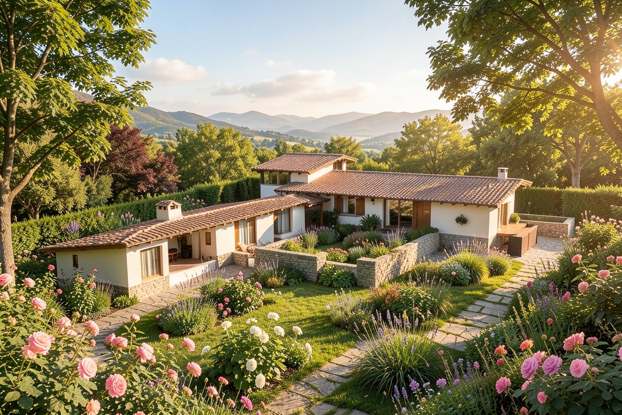 clean modern timber architectural exterior rendered in cinematic bright mid day lighting with vibrant blue skies and fluffy white clouds mountain modern with heavy timber architectural style select grade horizontal cedar siding beautifully lush green manicured landscape around structure with hedges and gardens black standing seam metal roof prominent cinematic forest with big trees and lines of orchards in the background with mountains in the far distance high fidelity photorealistic visualization crisp shadow falloff refined facade geometry soft atmospheric depth premium architectural photography mood ultra clean composition and materials dark trim around windows