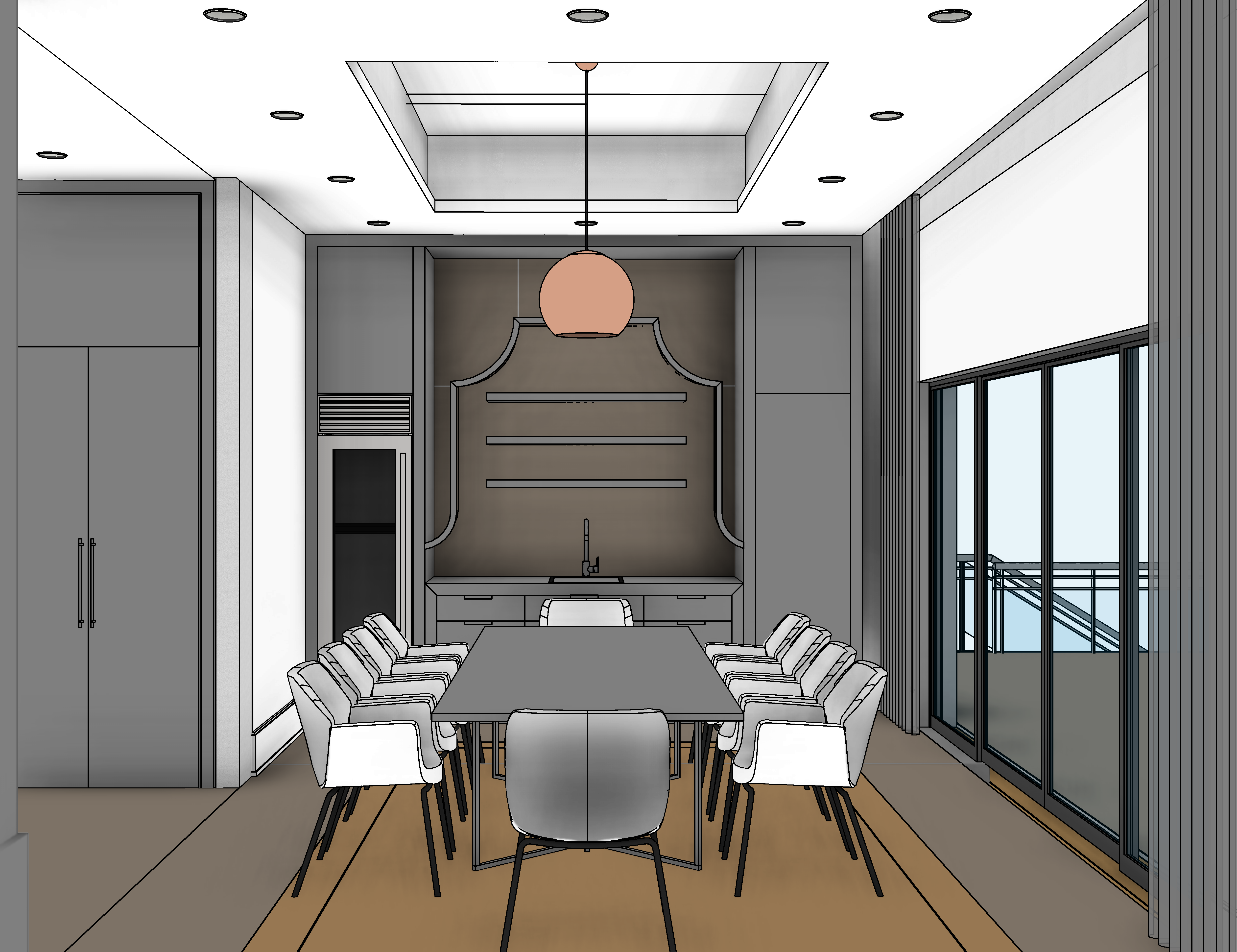modernist interior shot luxurious dining room interior with cabinetry in warm rift cut oak patagonia marble countertop and backsplash floor in a luxe beige limestone large format porcelain tile with a warm wood herringbone pattern inset off white ceiling color architecture