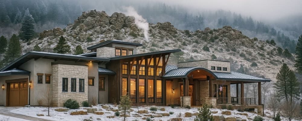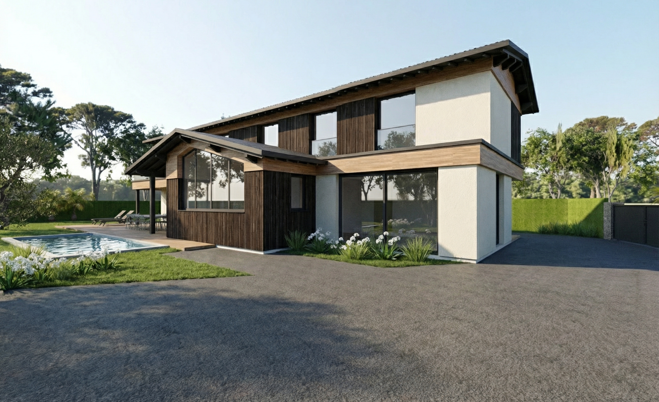 change all stone siding to vertical black steel siding zoom out and show entire home in the photo