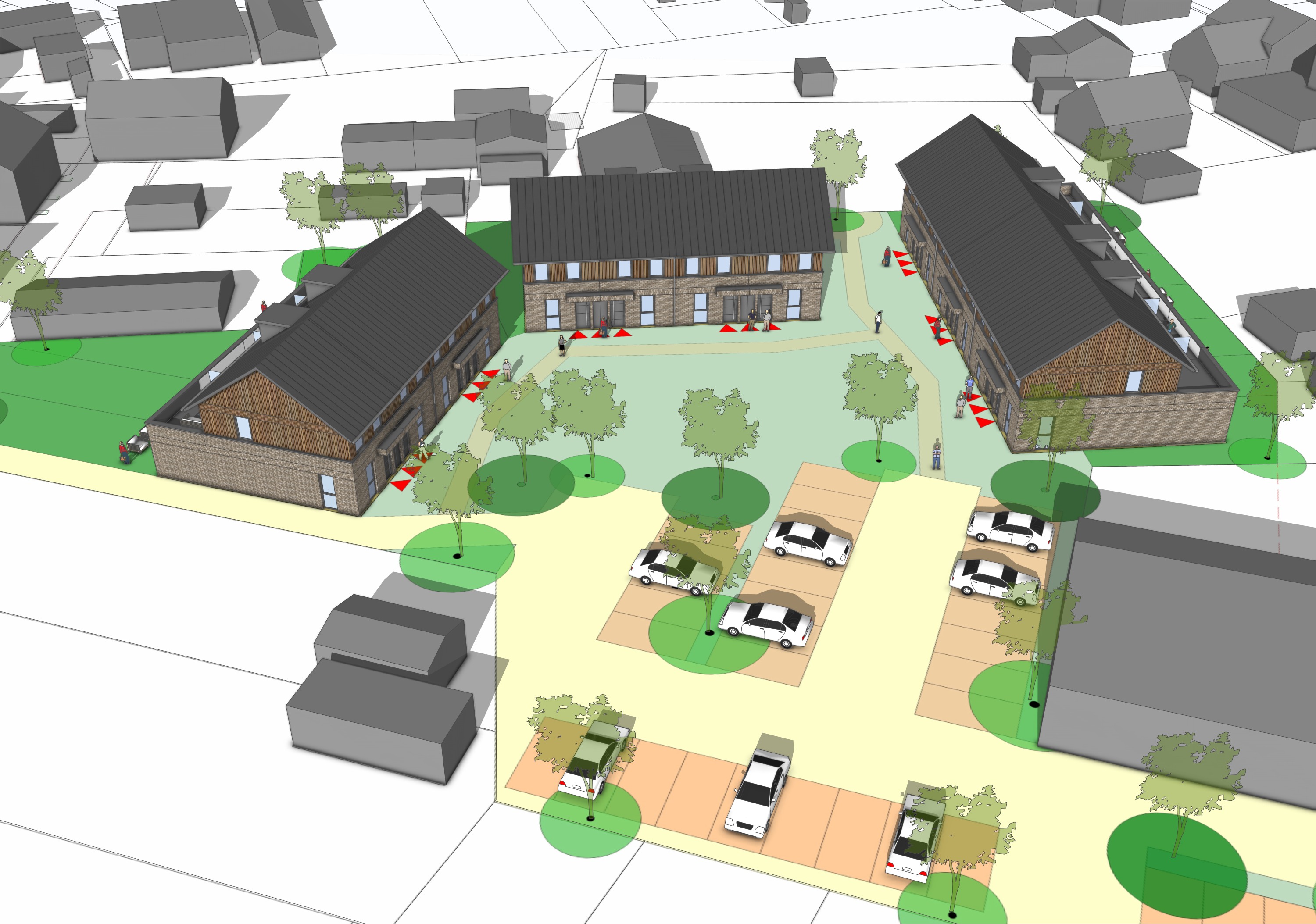 make this scene a phhotorealistic aerial view keep the grey buildings exactly the same as the original also keep the white plains the same