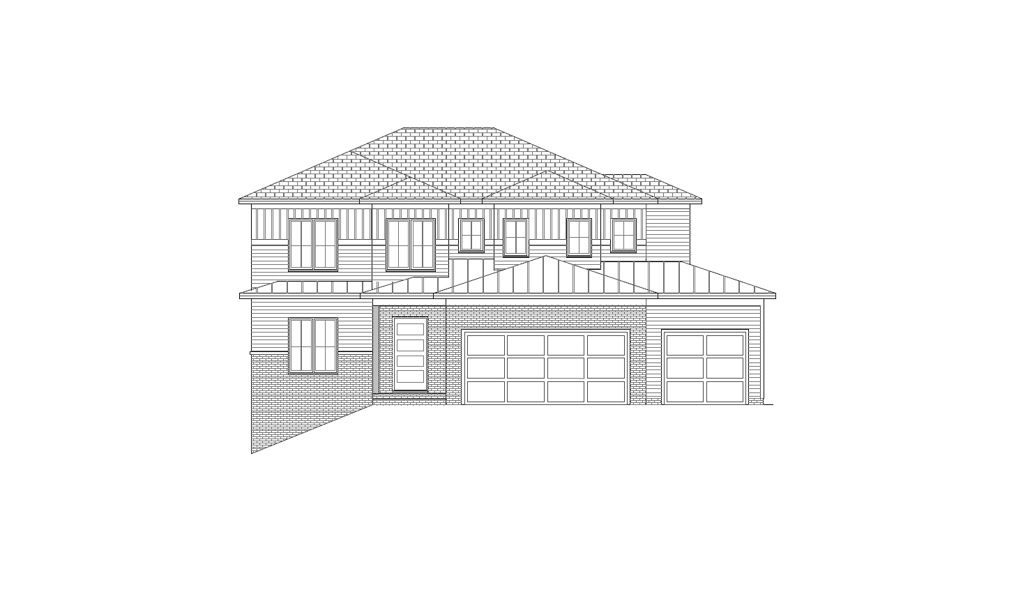 exterior shot render a modern two story house with a gabled roof featuring light gray brick on the lower half and white horizontal siding on the upper half use dark gray for the roof shingles and a rich charcoal color for the garage and front door the windows should be framed in white for a clean crisp look surround the house with a lush green lawn and add vibrant flower beds in warm tones of red yellow and orange at the base the sky should be a clear blue with soft white clouds casting a gentle afternoon light creating a cozy and welcoming atmosphere