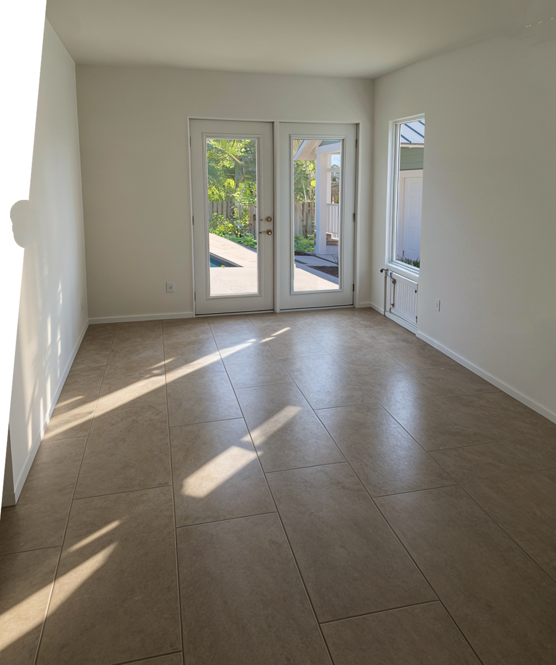 lighter beige limestone floor teal curtains