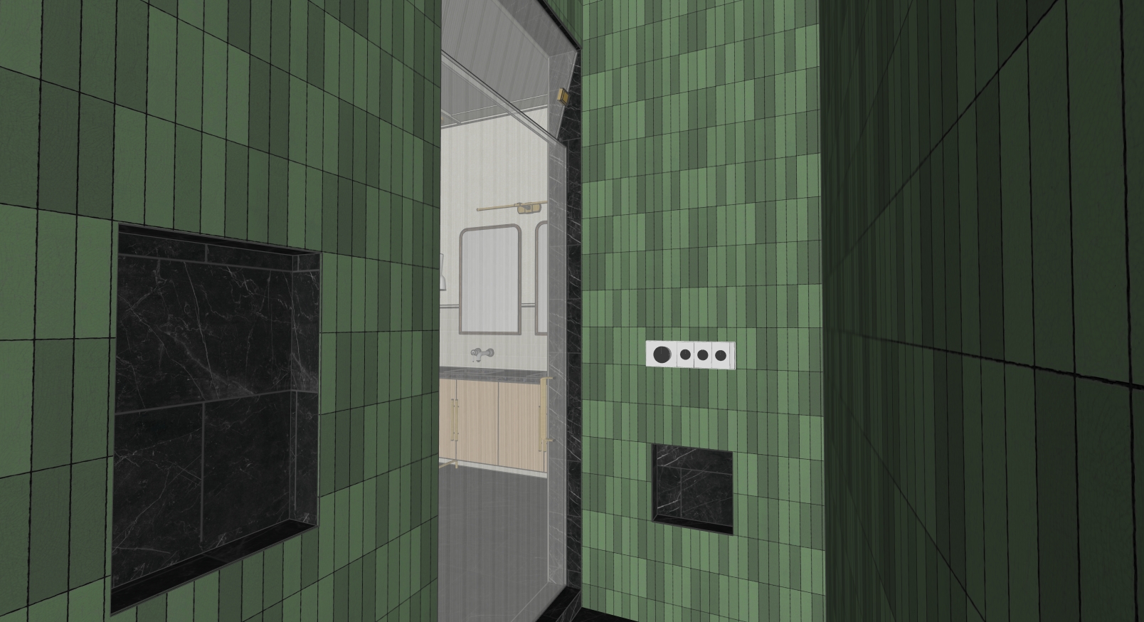 maintain geometry polished nickel controls green tile in shower reeded glass shower door bottles in niche