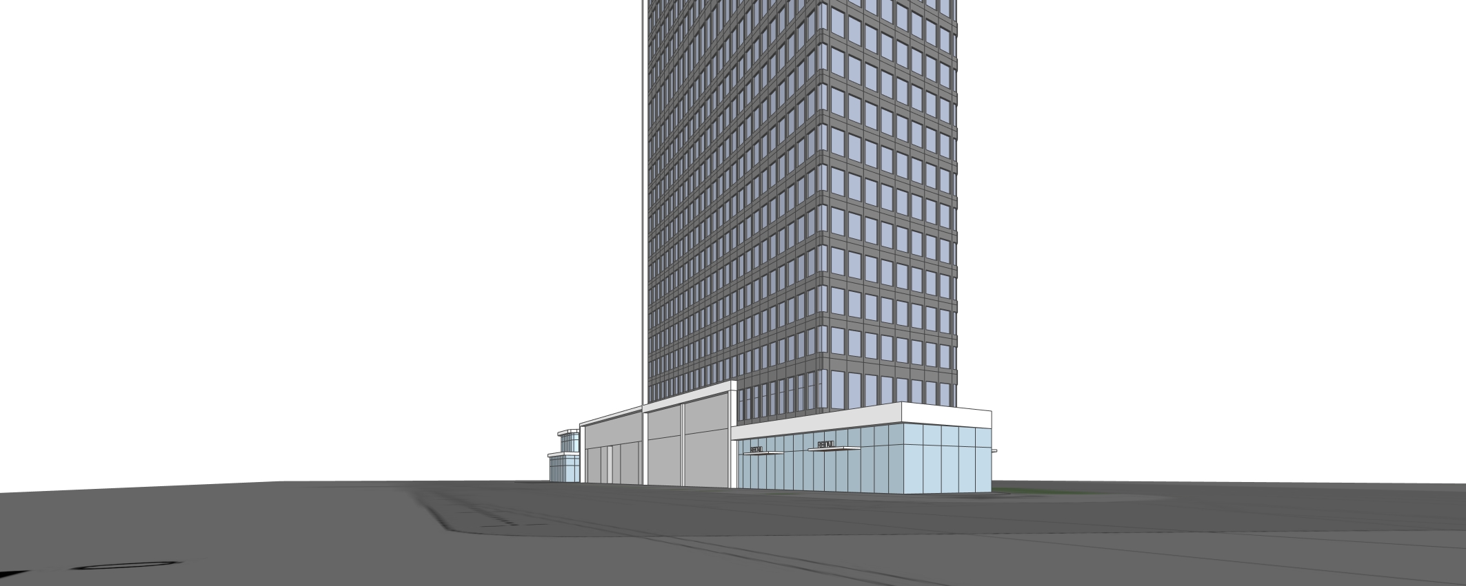 maintain mass add retail at ground floor on left mass only daytime view no cars glass tower above