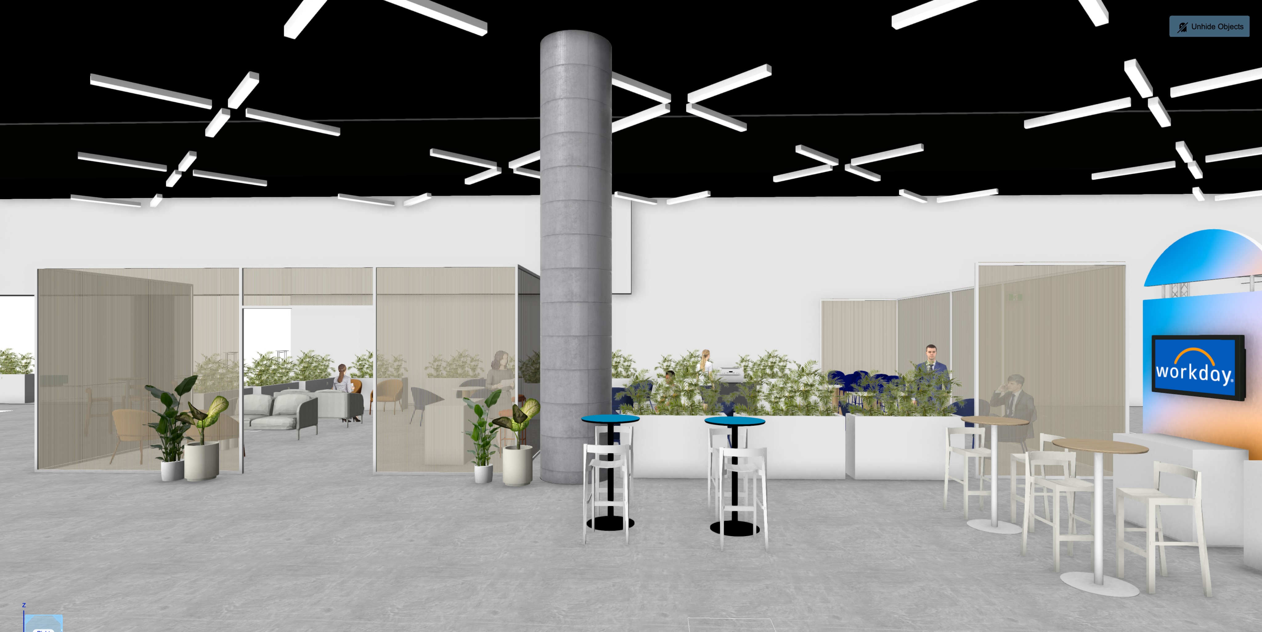 a modern exhibition hall business people walking around the room and seating on furniture soft medium lights