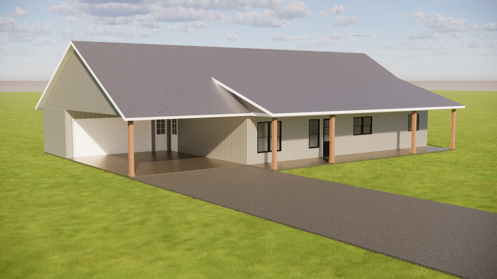 photorealistic architectural rendering front elevation of a rural east texas farmhouse cream colored r panel vertical metal siding galvalume standing seam metal roof with white trim cedar timber frame gable truss over the covered front porch black framed windows black front door attached garage on the left with covered breezeway early afternoon bright sun clear blue sky with a few scattered cumulus clouds east texas fall landscaping mature post oaks and red oaks with orange and red foliage native bluestem grasses a few loblolly pines in the background russet and gold ground cover split rail fence optional warm golden hour adjacent lighting long soft shadows shallow depth of field hero three quarter perspective from the front left preserve all existing windows doors rooflines and structural geometry exactly as shown ultra detailed 8k architectural photography style