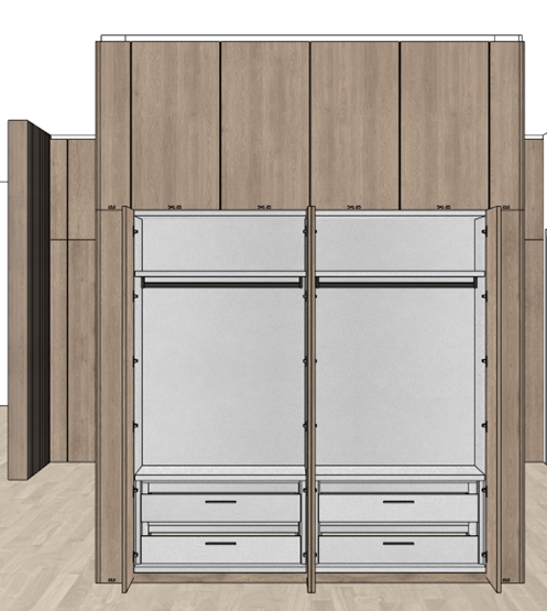 do not change the original details and do not change the materials and finishes shown wood on the outside off white leather on the inside remove drawers handles and little notes on the doors add jackets and coats inside do not add lights