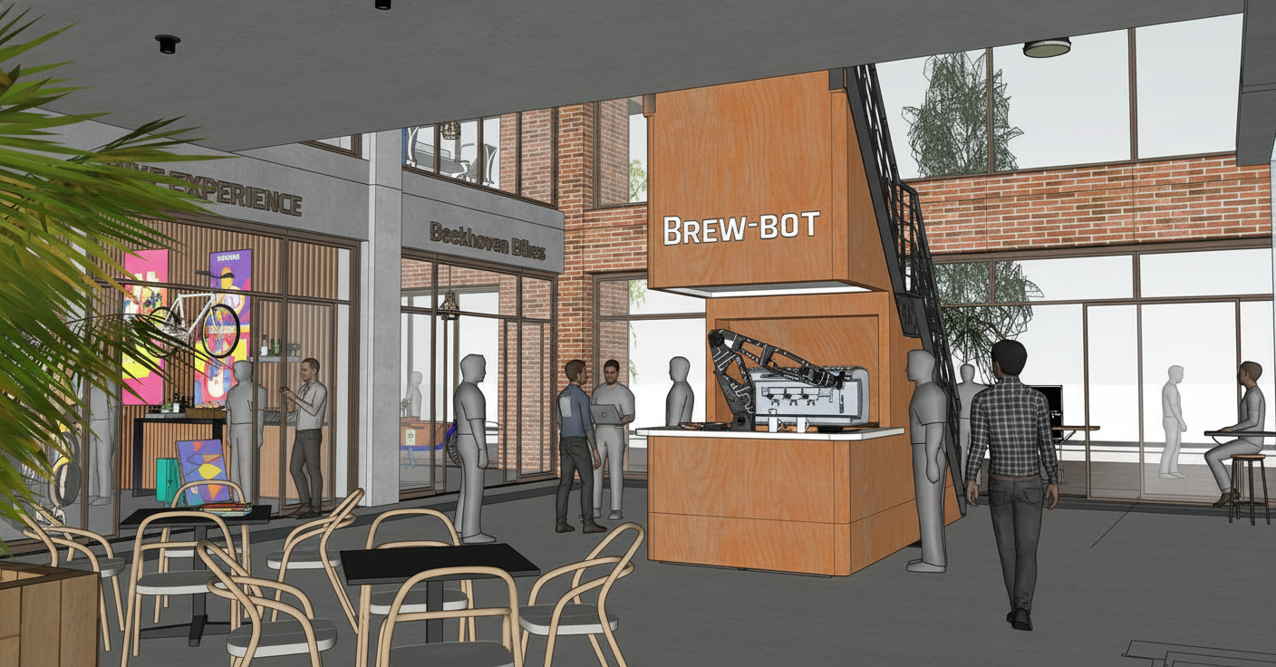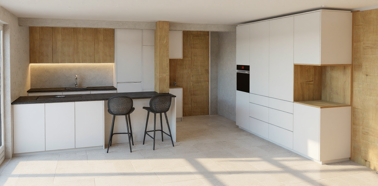 modernist interior shot industrial coworking space wooden details white walls concrete floor light ambience architecture
