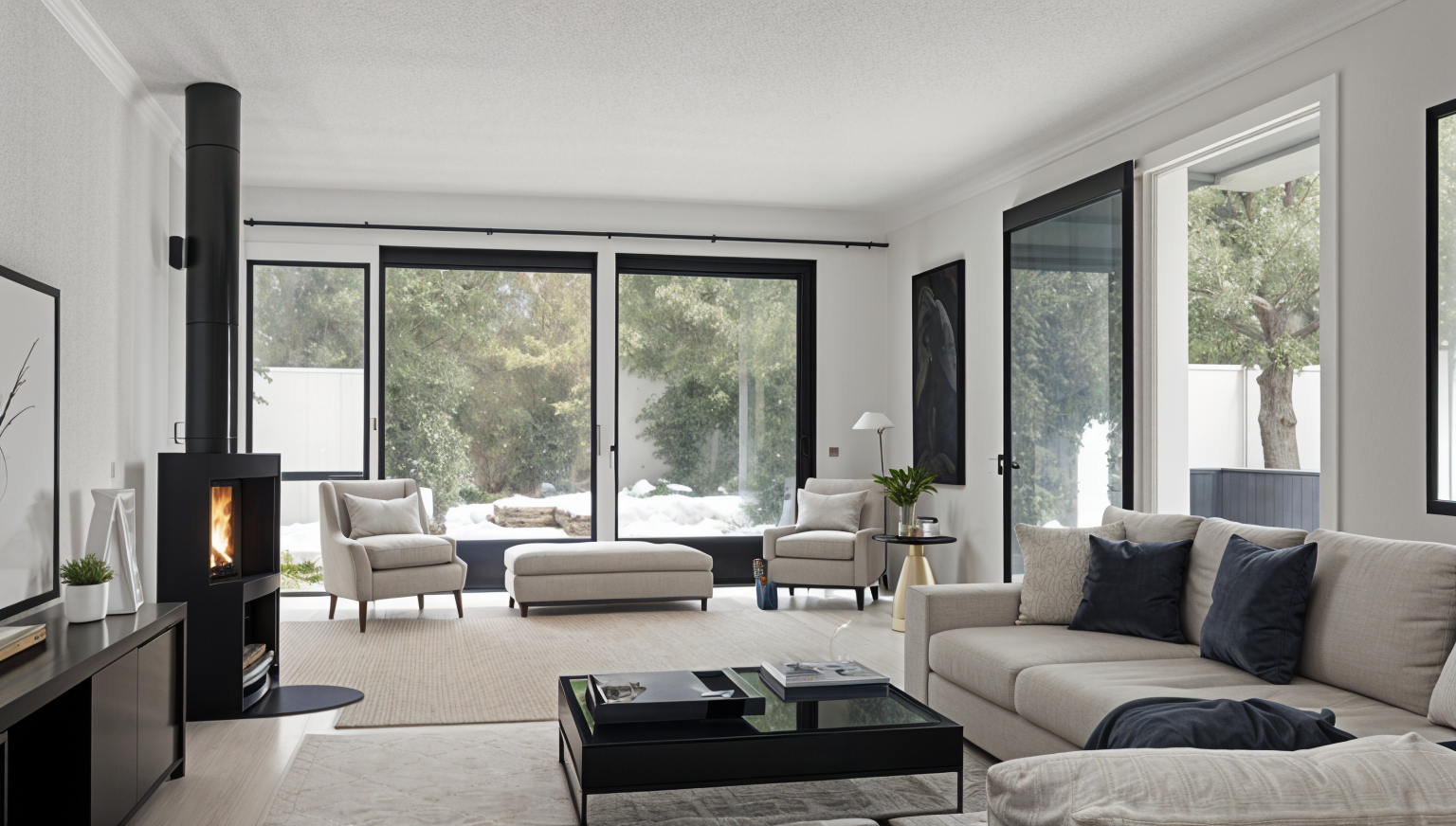 render a modern residential area with a series of minimalist houses the houses feature clean white facades and warm wooden accents use a bright sunny atmosphere with a clear blue sky the road and pathways are a smooth gray curving gracefully through the scene lush green grass lines the sides of the roads adding a vibrant contrast the overall mood is peaceful and inviting with a contemporary aesthetic add cars on street people planting trees back ground planting keep walls to front