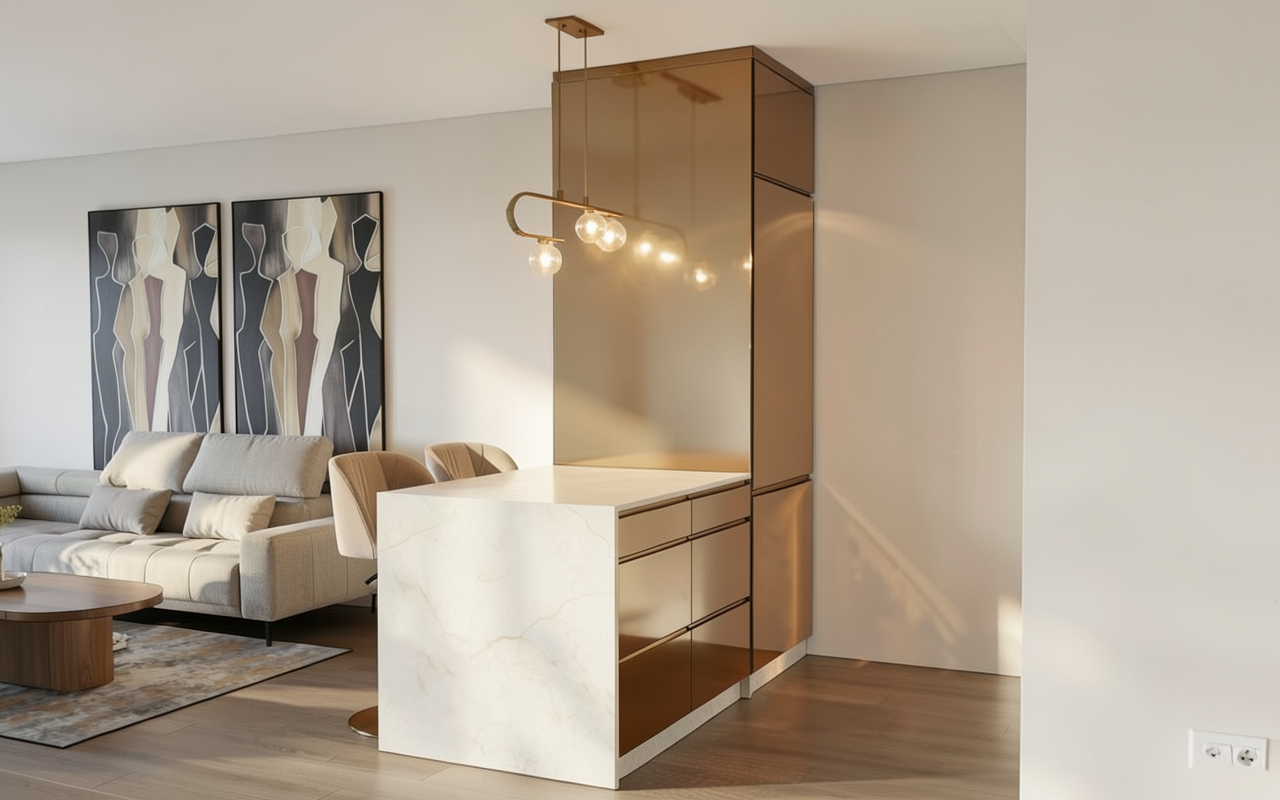 lock and keep the geometry exactly as provided convert this 3d model screenshot into a kodak portra 400 photograph deep cobalt blue spring sky high lateral sun from left 5800k hard edged shadows high contrast exterior sunlight passes through the glass block facade projecting fragmented light patterns and sharp shadow grids onto the interior floor and walls no interior artificial lighting tall mature washingtonia filifera palms in background creating depth and fronds casting long dappled shadows across the facade cupressus sempervirens vertical dark accents framing the composition euphorbia canariensis sculptural clumps at podium base bougainvillea spectabilis climbing the base of the metal structure magenta bracts dense and trailing other mediterranean bushes are planted dry fescue and mineral soil between planting zones clear passage zones a single washingtonia filifera palm frond enters the right edge of the frame as a natural vignette partially overlapping the facade sharp in the foreground seves nevada glass blocks 19x19x8cm horizontal running bond 8mm portland cement joints surface waviness refracting and scattering daylight creating caustic light patterns inside blocks read as dense translucent stone lit entirely from exterior sun pilasters portal frame and podium in board formed terracotta pigmented concrete 20cm shutter lines light carbonation background curved wall in terracotta toned render with fine continuous horizontal grooves along its full length grooves approximately 10mm wide and 5mm deep casting thin shadow lines in the lateral sun structural elements and cantilevered shelves in black anthracite metal matte finish terrace in smooth beige concrete clean flat surface tight joints warm terracotta against cobalt sky exterior empty of people kodak portra 400 elevated reds and oranges gentle highlight roll off lifted shadows slight lateral chromatic aberration at frame periphery no grain no vignette 1980s architecture magazine editorial look hairline crack at second pilaster base calcium streaks from two mortar joints dust on shelf surfaces peri urban northern morocco