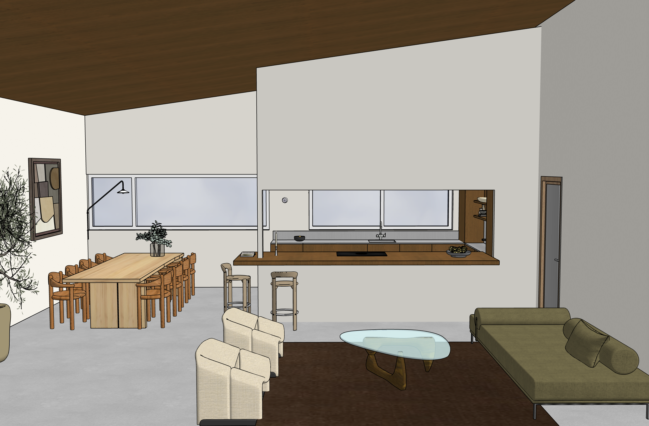 floor is concrete rug under coffee table island of the kitchen is a wooden worktop