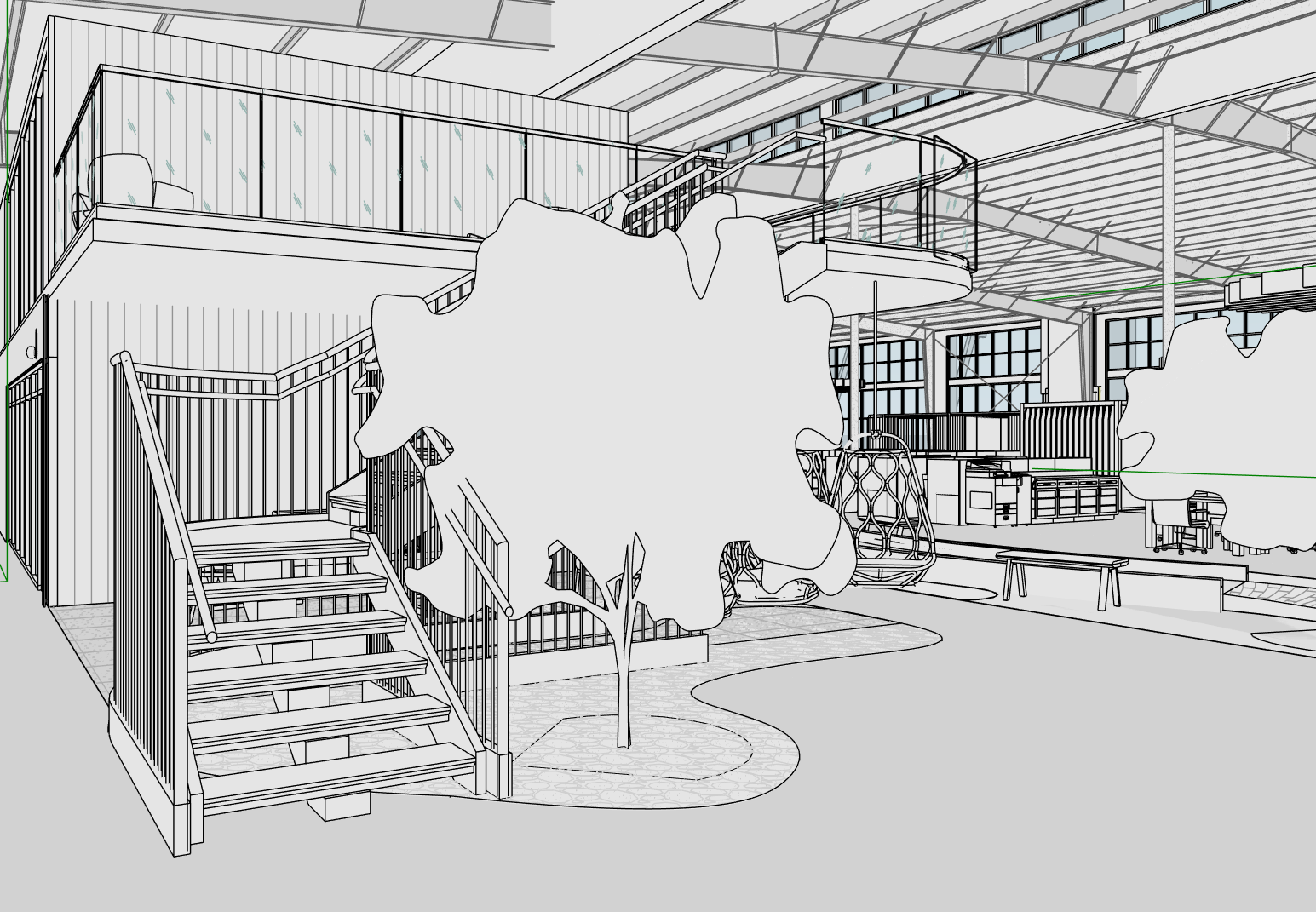 make this look realistic make the stairs black with a wood railing make the walls vertical light wood cladding make the floor concrete make the floor around the tree small landscaping rocks