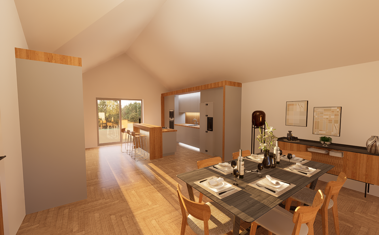make this kitchen and dining area look more realistic and modern use luxury materials for the kitchen i want the units to be a nice ligth grey tone with white worktops and warm led lighting make the dining table a nice slate with black chairs that have cream fabric make the natural light come in from the patio doors and add evenly spaced led downlights in the roof that are flush lighting