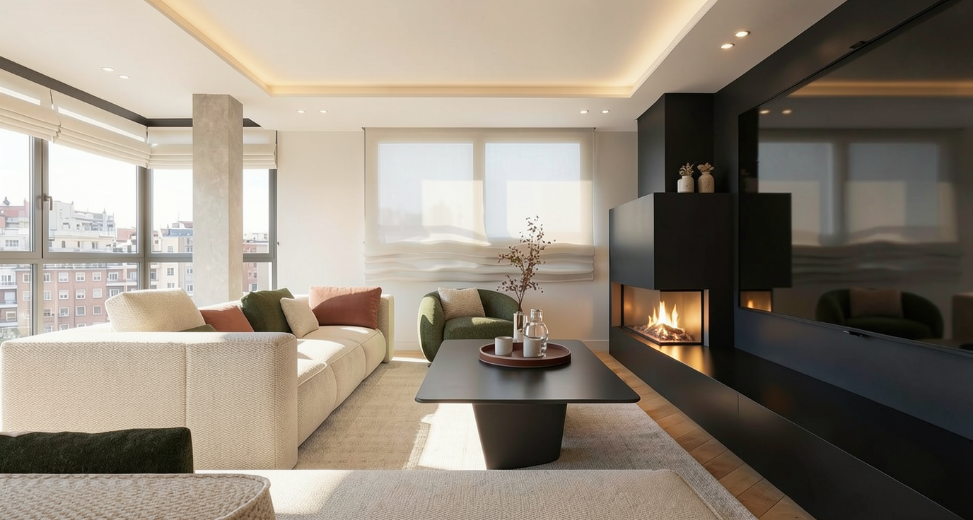 necesito mejroar esta imagen primero el tono de la imagen es demasiado amarillento hay que regular el balance de amarillo por otro lado la chimenea es un caset integrado en un modulo de pladur que debe ser en color grafito oscuro casi negro la parte baja que se aprecia en la imagen como microcemento y que continua por debajo de la tv tambien debe ser efecto lacado mate negro pero el panel trasero de la tv sigue siendo madera en esta imagen tambien se ve la zona de comedor que en prncipiono debes hacer nada con ello