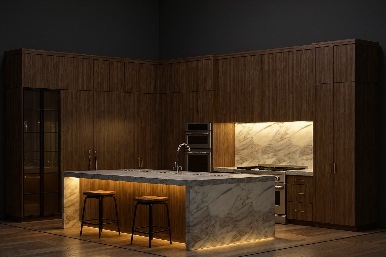 transitional modern french country primary bedroom window seat with plush cushion wisconsin northwoods outside of first level window grasscloth ceiling substantial crown molding modern fluffy bedding on four poster bed vintage sisal rug on floor