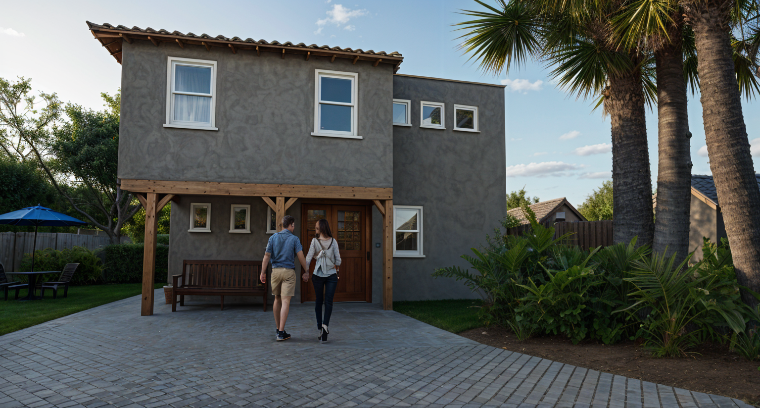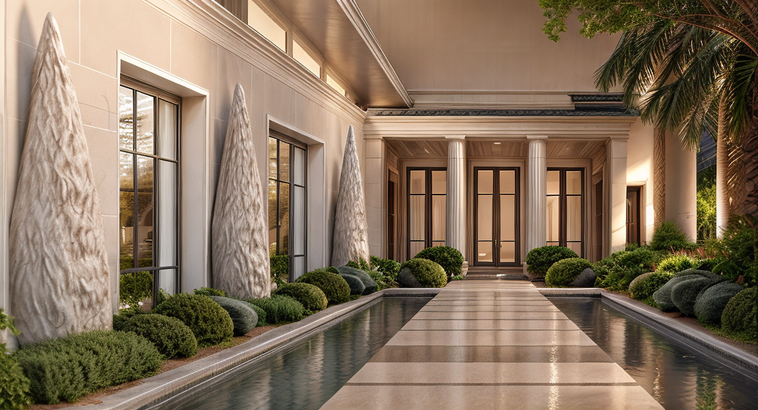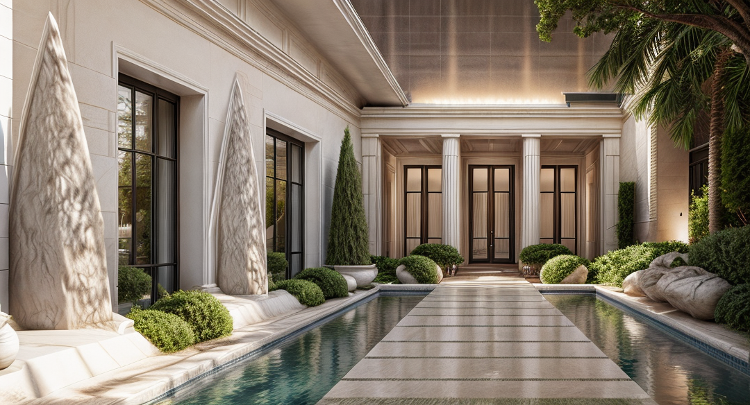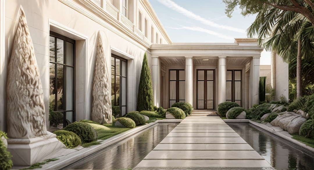 emphasis the classical elements on this modern house make the stoned cladding smooth add mediterranean style landscaping add lighting to the interior of the house keep the roof flat add architraves to the window and door openings make the stone textured external walls smooth light stone add uplighting to the exterior of the building