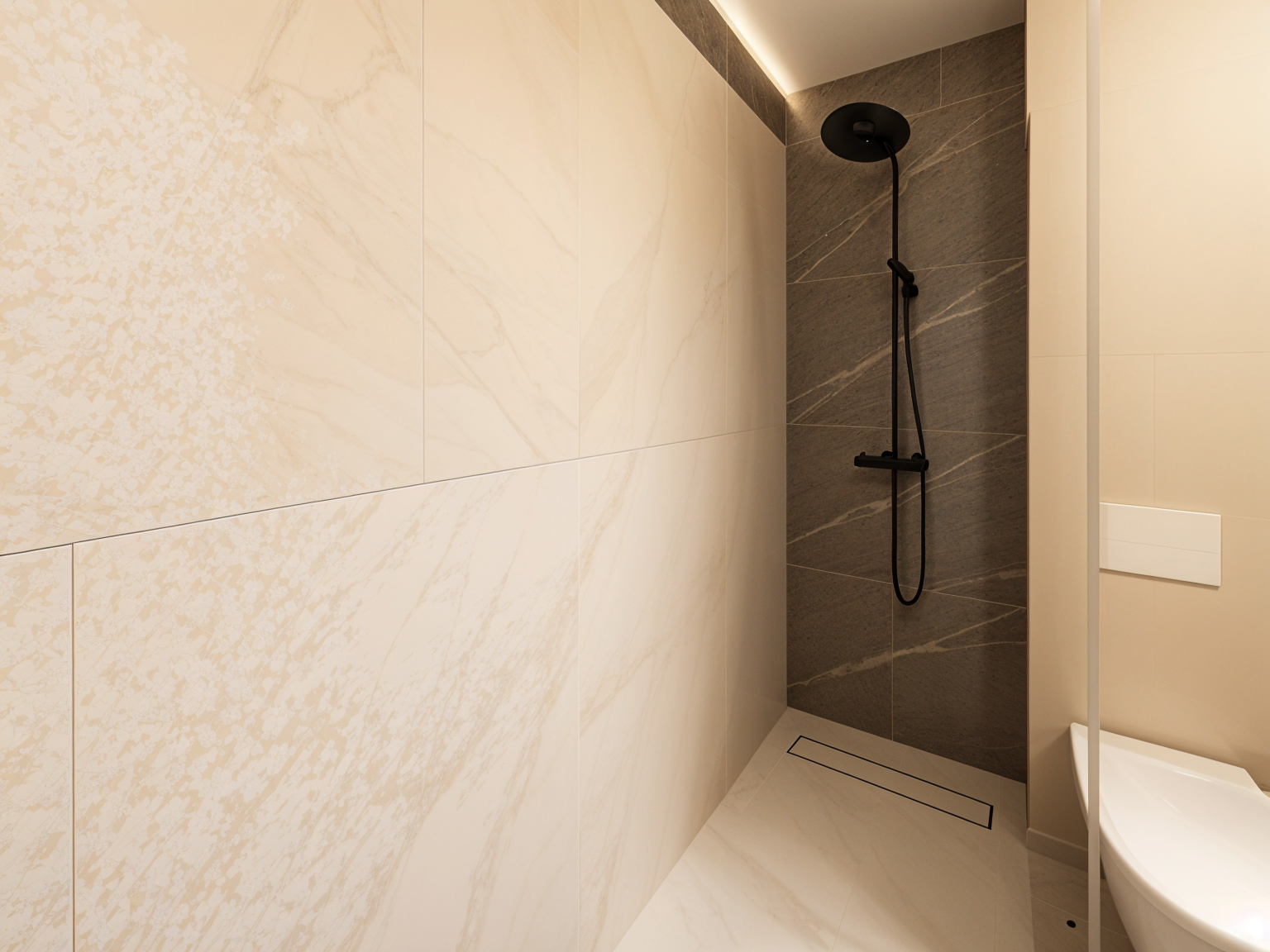 render a rustic house with a warm inviting atmosphere the walls are a rich dark brown wood accented with green corrugate metal corten on the side walls the roof is a light beige with textured shingle tiles windows have light wooden shutters and the front door is a deep black the porch is decorated with light wooden flooring the overall mood is cozy and serene highlighting the harmony between nature and architecture under a clear blue sky with soft diffused sunlight and mountains and big trees and pines