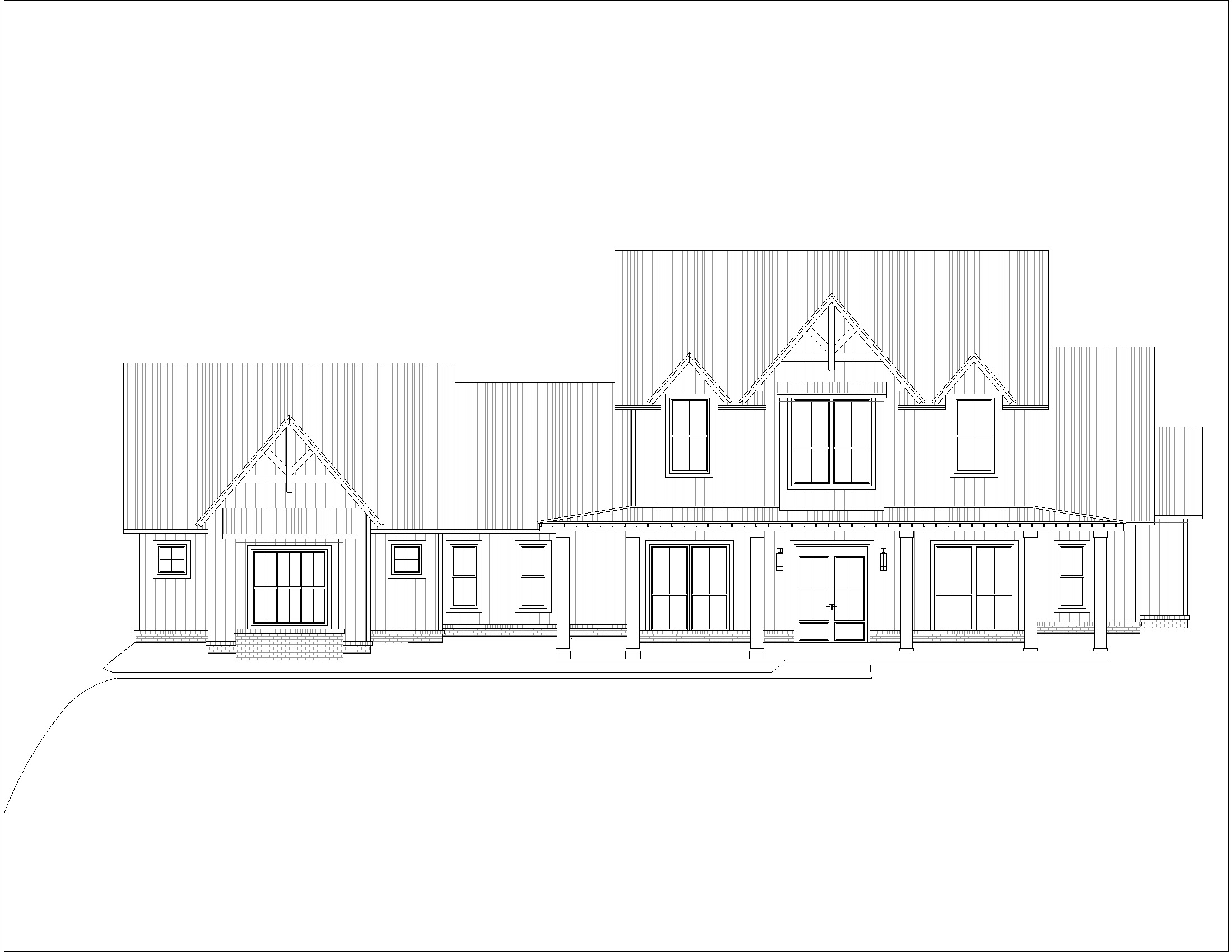 modern farmhouse with white vertical board and batten siding red brick wainscotting from ground to two foot up only dark metal roof and awning over window dark cedar post and accents dark cedar double front door with windows show full house