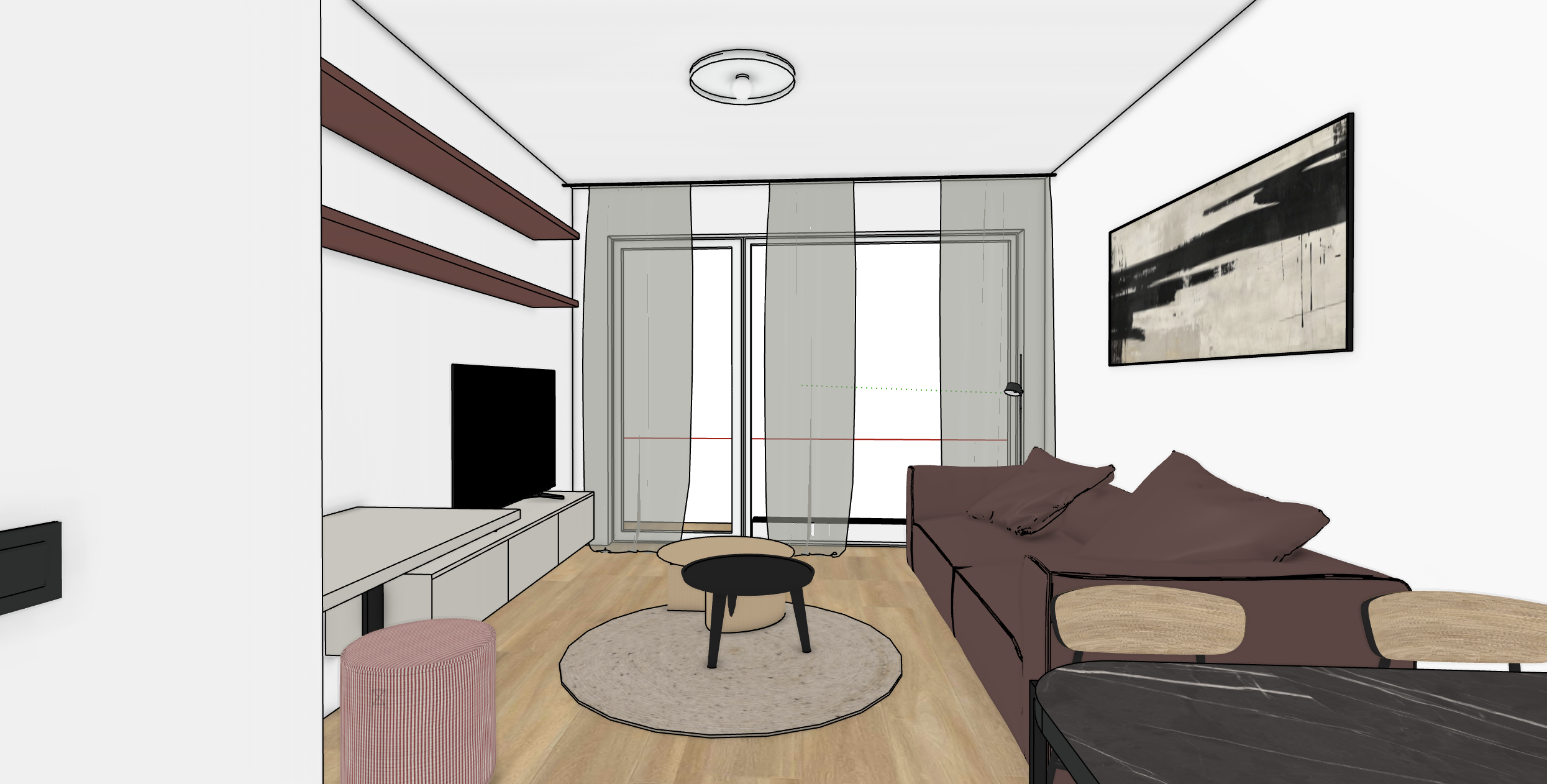 modern living room light oak wooden floor greybeige on tv cabinets with red taupe shelves on the tv wall white walls soft shadows