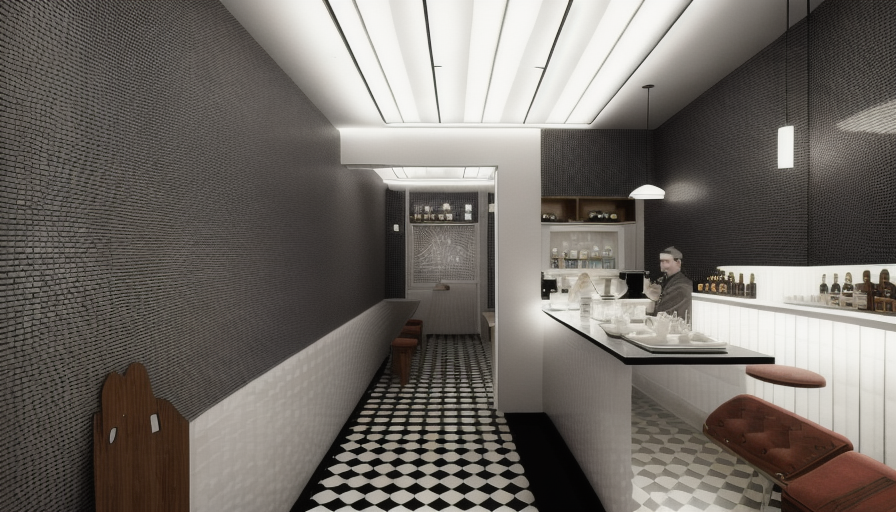 bakery shop window with fresh bread and pastries on display tiled white wall with los santi s sign warm natural daylight realistic textures of bread and glass ultra realistic render