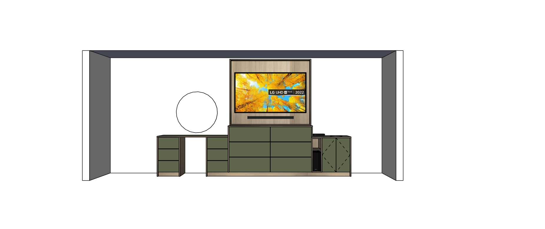 render as image change no details other than back light the tv and circler mirror and antique brass handles on drawer fronts and doors