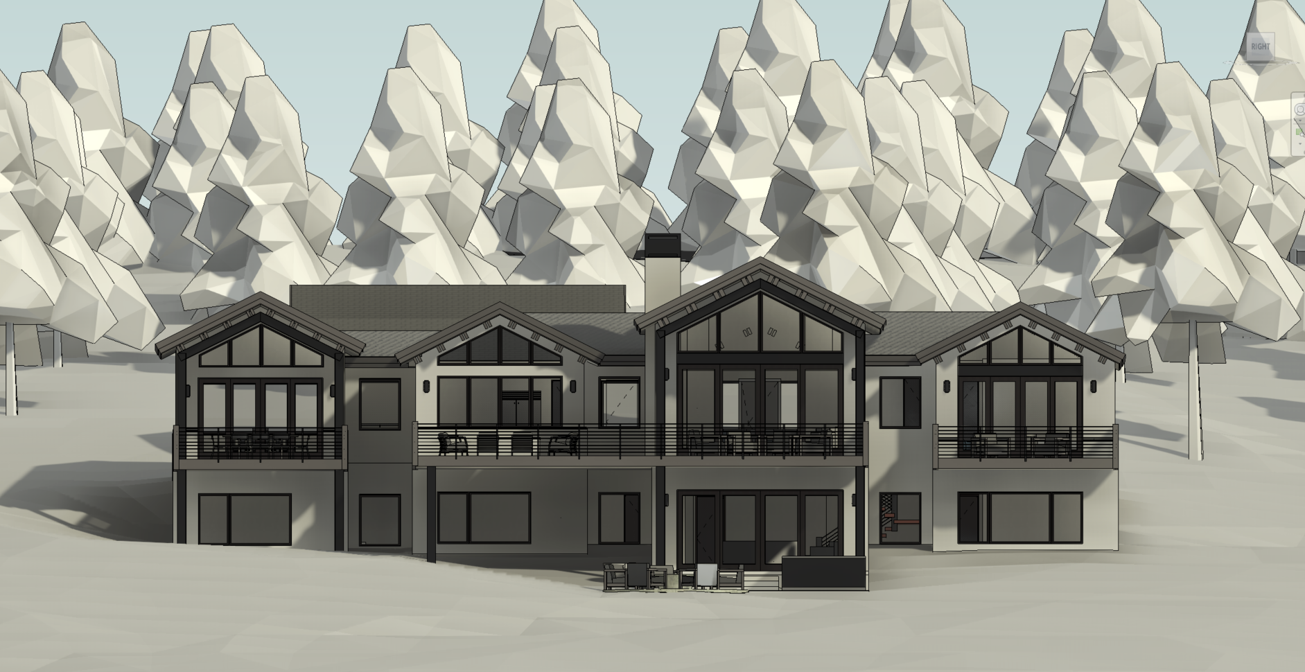 exterior shot traditional snowy pine forest uphill dark wood exterior stone base pine forest wood siding architecture